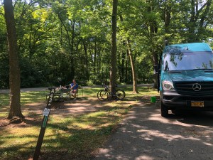 The next morning we were on our way north towards Lake Erie. We stopped at a Home Depot and Dollar Tree to pick up a few things. People were actually wearing masks in this area where we stopped. I’d say about 50 % of the shoppers which is much better than it’s been in most of the other stores we have been in. We picked up 2 bike holders and some wood for Greg to install a more permanent and easier way to hang our bikes vertically inside the van. Up to this point we have attached them using bungees, it’s been working out fine but with having to take the bikes in and out every day, it would be nice to have an easier method. Our friend Frank told us about these vertical wall hooks so we will give them a try.