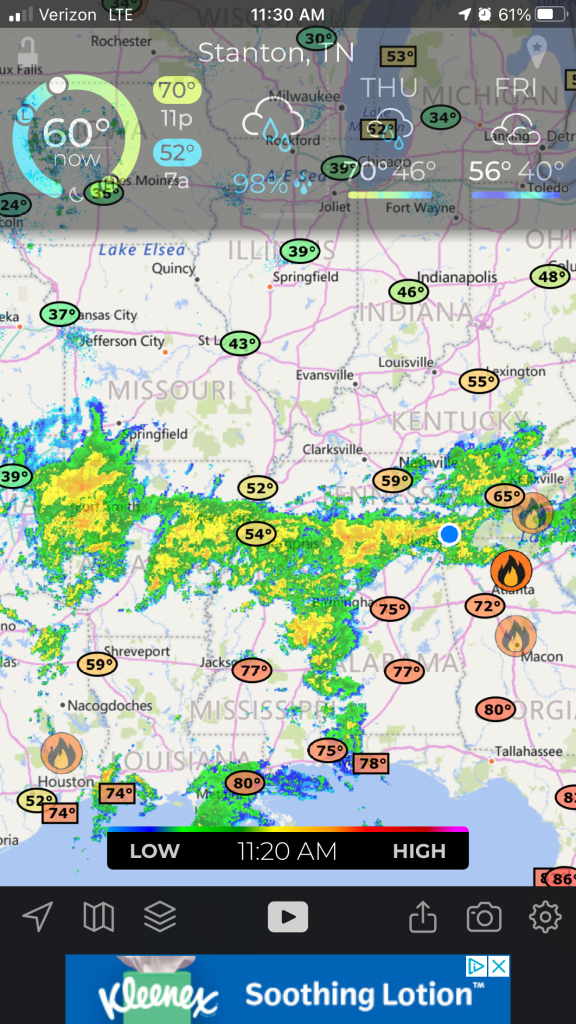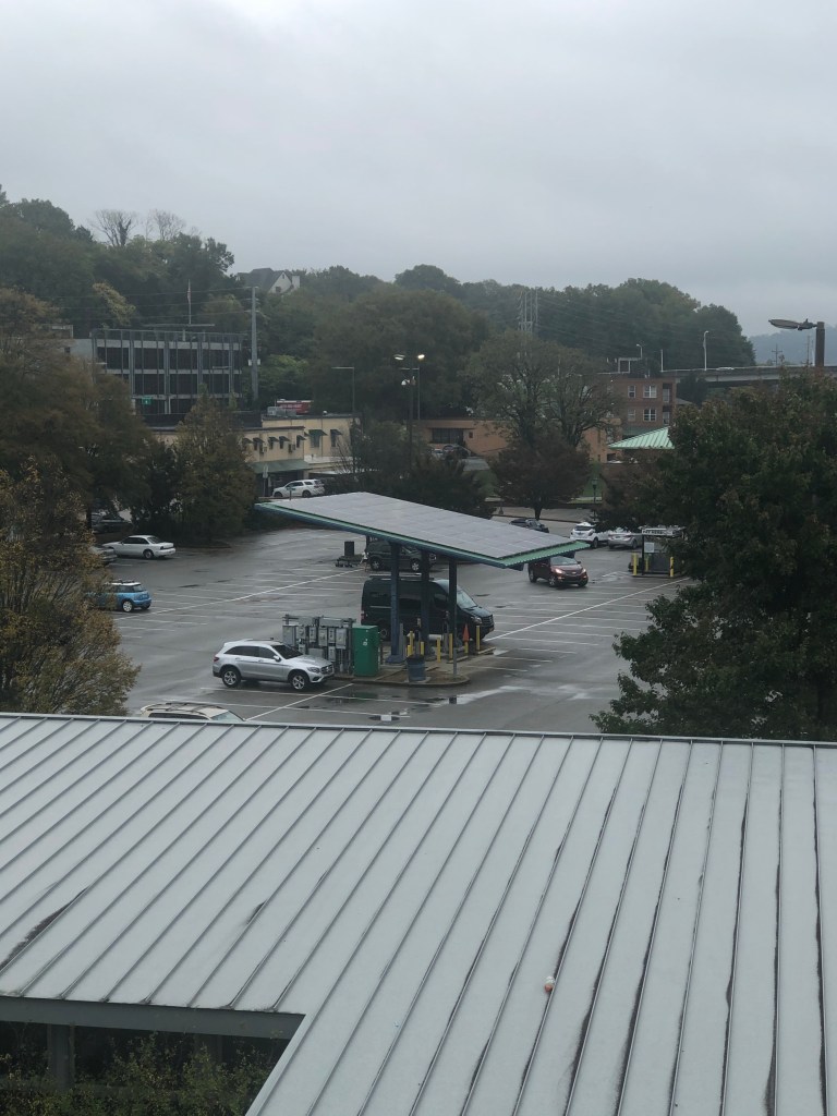 We check the weather constantly and even more so when there is a known hurricane coming our way. We saw two full days of rain and wind coming so we hunkered down in the town of Chattanooga in a 24 hour paid parking lot. We figured if we are gonna be stuck in the rain at least we could find shops or coffee shops to kill some time, plus we wanted to be away from any trees that had the potential of falling on us and the van. This paid lot was perfect.