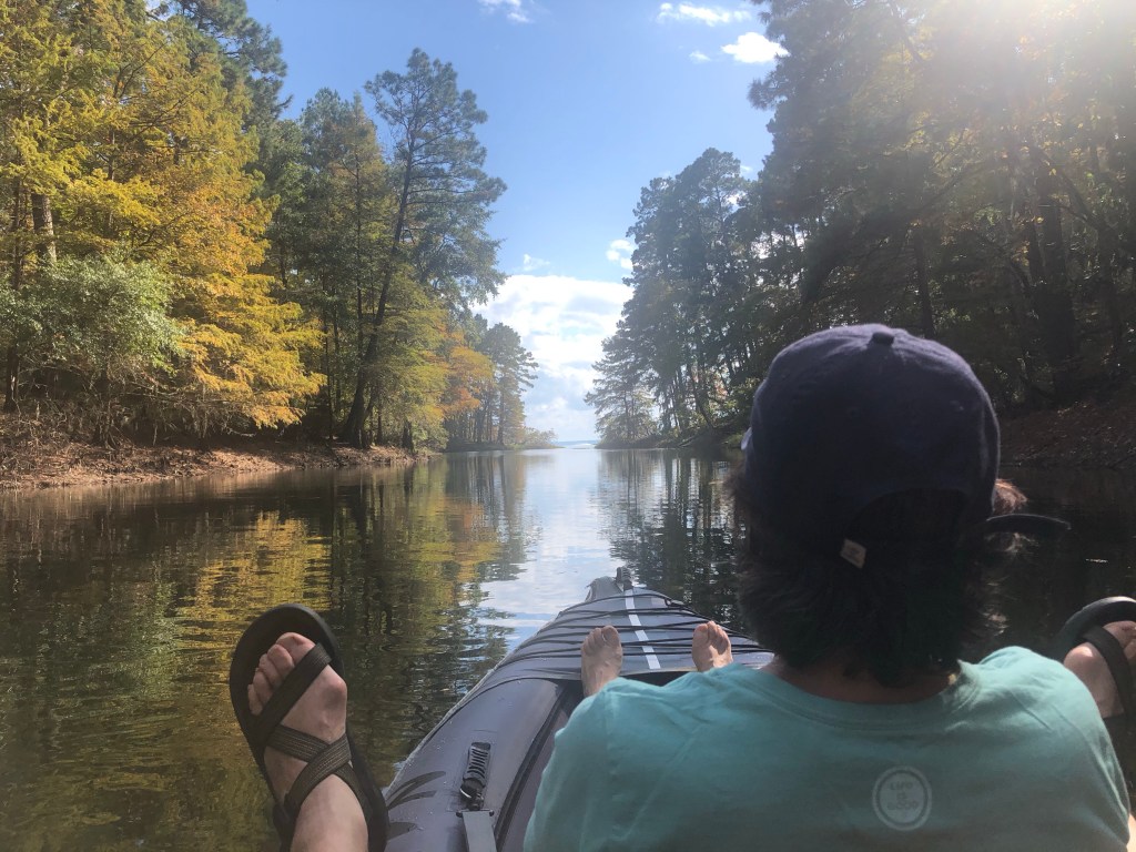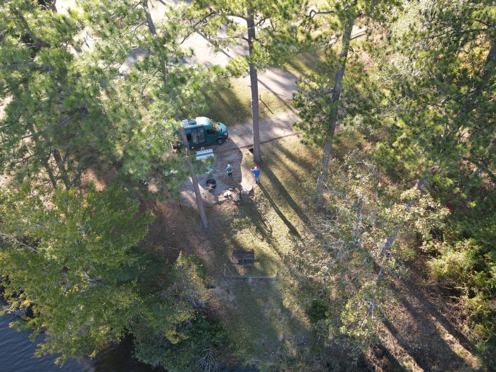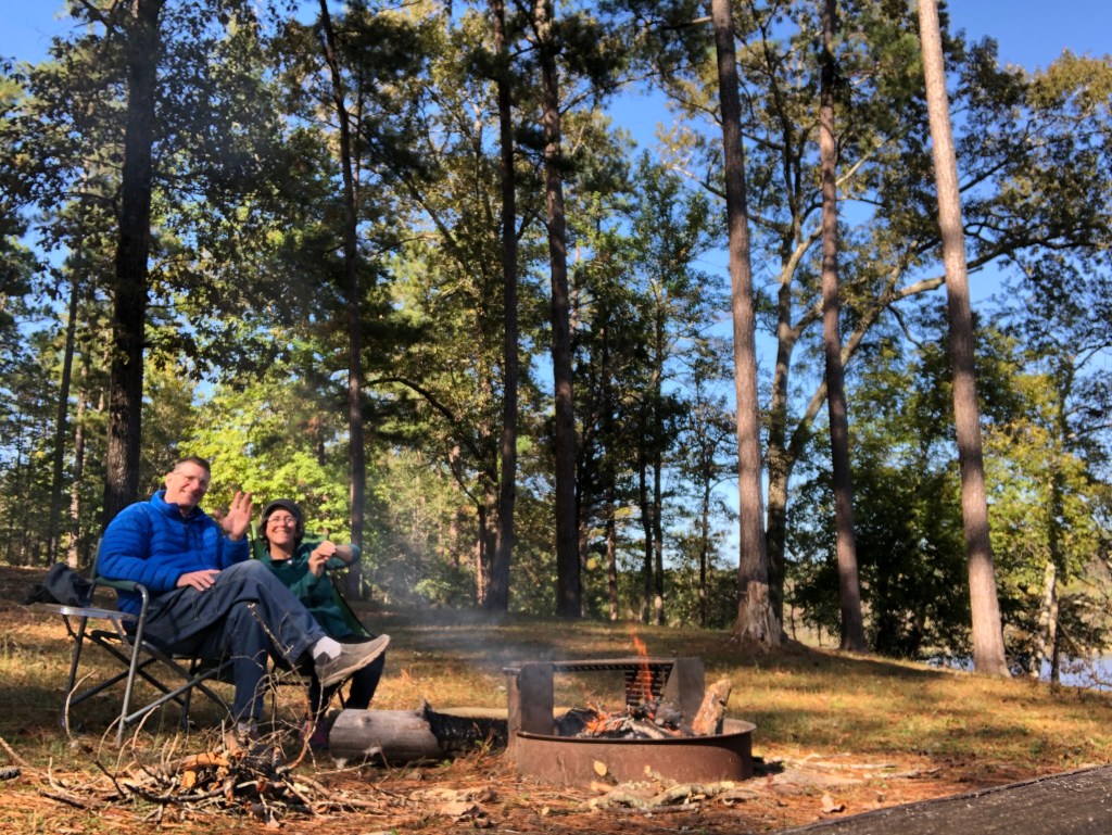 Our first night here was fantastic there was a guy across the way who ran his generator for most of the night but it was far enough away that it wasn’t that bad and we were joking around about well at least he’s not next-door to us that has to be the worst if he was right next-door to us and then the next day a camper pulls up and we see the guy unload a great big generator. On top of that he pulls out a leaf blower and starts leaf blowing his site for a good 20 minutes. We had never seen this before. We are in the middle of a national forest in Texas it’s kind of a pine forest so there aren’t even really any leaves on the ground and this guy is leaf blowing his entire campsite it was just crazy. That night we had the two generators going one across the campground and one right next-door. We had a nice fire going and we’re trying our best to block out the noise of the generators when we saw these two beautiful bald eagles flying right into our campsite and up on the tree right in front of us. We tried to get up quick to get a picture for you guys to see them but as we made our way around the tree, they flew off. So majestic!! As they fly off, two otters swim in to the small cove to our left. So cute.