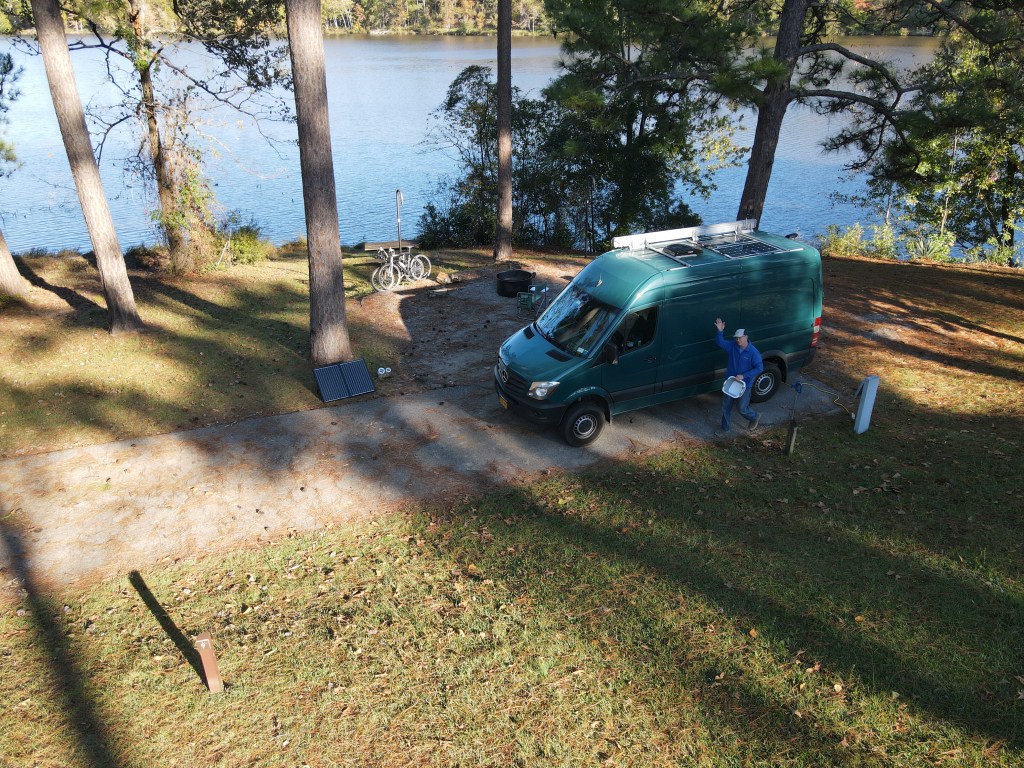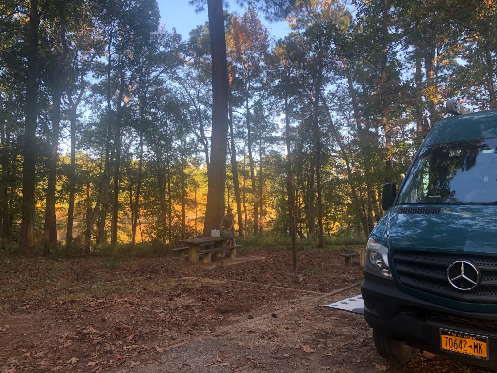 Our next stop was a private campground. we needed electric and we needed showers so we found a place from our passport America membership which was along the way. We arrived at the Cherokee RV campground resort and made our way through the Sanford and Son Junkyard entryway to get to the office where we stood for awhile waiting for someone to come out. A large fellow came in finally and asked us if we rang the doorbell. We hadn’t seen a doorbell, he told us it’s outside the door where we proceeded to go outside and ring it. Then his mother appeared and the two of them began to interview us about the van and whether we would be accepted into this fine establishment for the night. It really was quite bizarre considering this place is probably the worst kept place we have seen in a while. Well they finally after much persuasion decided that we could spend the night in Billy’s spot cause Billy’s camper was in the shop and he probably wouldn’t mind.  We followed the mom to Billy’s Spot which was as basic as could possibly be. Not even a picnic table, or fire ring. And on top of that it was a pretty small spot with really old campers on either side. We were pretty afraid of even plugging in our electric as during the interview process they told us that vans like ours are not covered by their insurance because of an electrical fire that happened in the past before they took over this luxurious campground.   Billy’s spot is by the bath house which has ONE TOILET for over 100 campers. I’m telling you this is just bizarre!!! They also handed us a sheet of over 50 rules which includes them asking us to leave if they want us to leave.  Let’s talk about the showers…… they were checkerboard shower curtains, but every other square was clear. Really! You can see through the shower curtain which separated the shower stalls from one another.  I still took a shower anyway, but I took it at 6 o’clock in the morning. Not a creature was stirring.