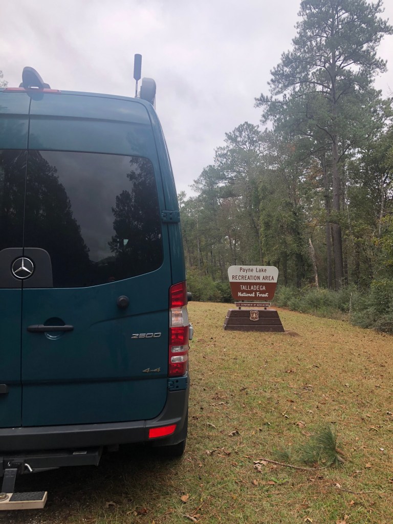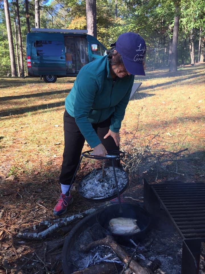 After that we went on a search for some Diesel for the van and then headed into the National Forest to spend some time at a National Recreational area called Payne Lake. This place is AMAZING!! There’s like 50 sites here. We got a beautiful sight right on the lake for SIX BUCKS  a night. There’s running water, hot showers, flush toilets, picnic table, fire ring all for six bucks. That disaster of a campground we stayed at last night was seventeen dollars. This place is like a dream! The camp host and his dog came over to introduce himself. Then a few hours later a law enforcement officer came by and asked us a bunch of questions. They definitely keep an eye on the park. It’s well maintained and just a super beautiful spot. We got a nice fire going and roasted a pork shoulder in the dutch oven pot on the fire. It came out great. Had it with salad one night and then pork quesadillas the next day for lunch.