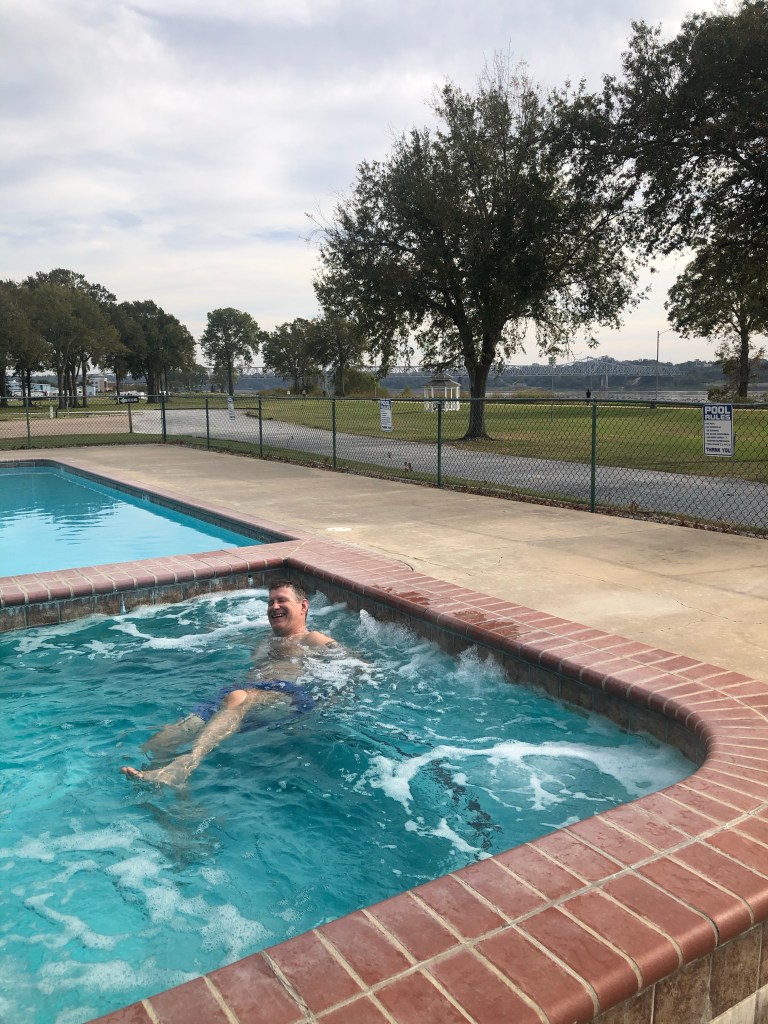We are currently across the Mississippi River in Louisiana at and RV park looking over the River. We took the Nachez Trace Parkway here which was sooooo amazing. I highly recommend it. We were planning on going back into the National Forest for tonight but then we found this place at a 50% discount with our Passport America Pass. (Thank you North Ridge friends) This place is pretty fancy. Pool, Hot Tub and every amenity you can think of. We desperately need to do laundry as well. I made that pork roast and then made quesadillas the next day. I swear, everything I own smells like a pork quesadilla. and we still have more leftover for tonights dinner. I’ll be glad to get it out of the fridge. Every time we open the fridge, it smells like bologna.