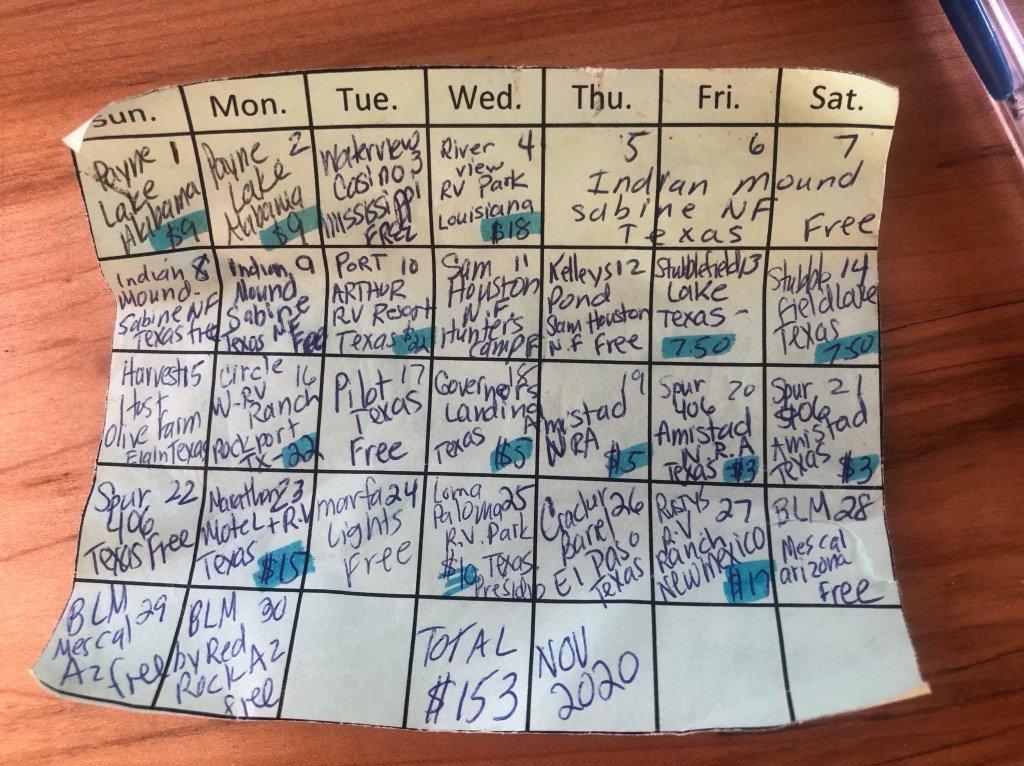 So I just noticed that today is December 1st and we officially have been on the road for a month. We have been keeping track of each night and our grand total for camping fees was $153 for the entire month.