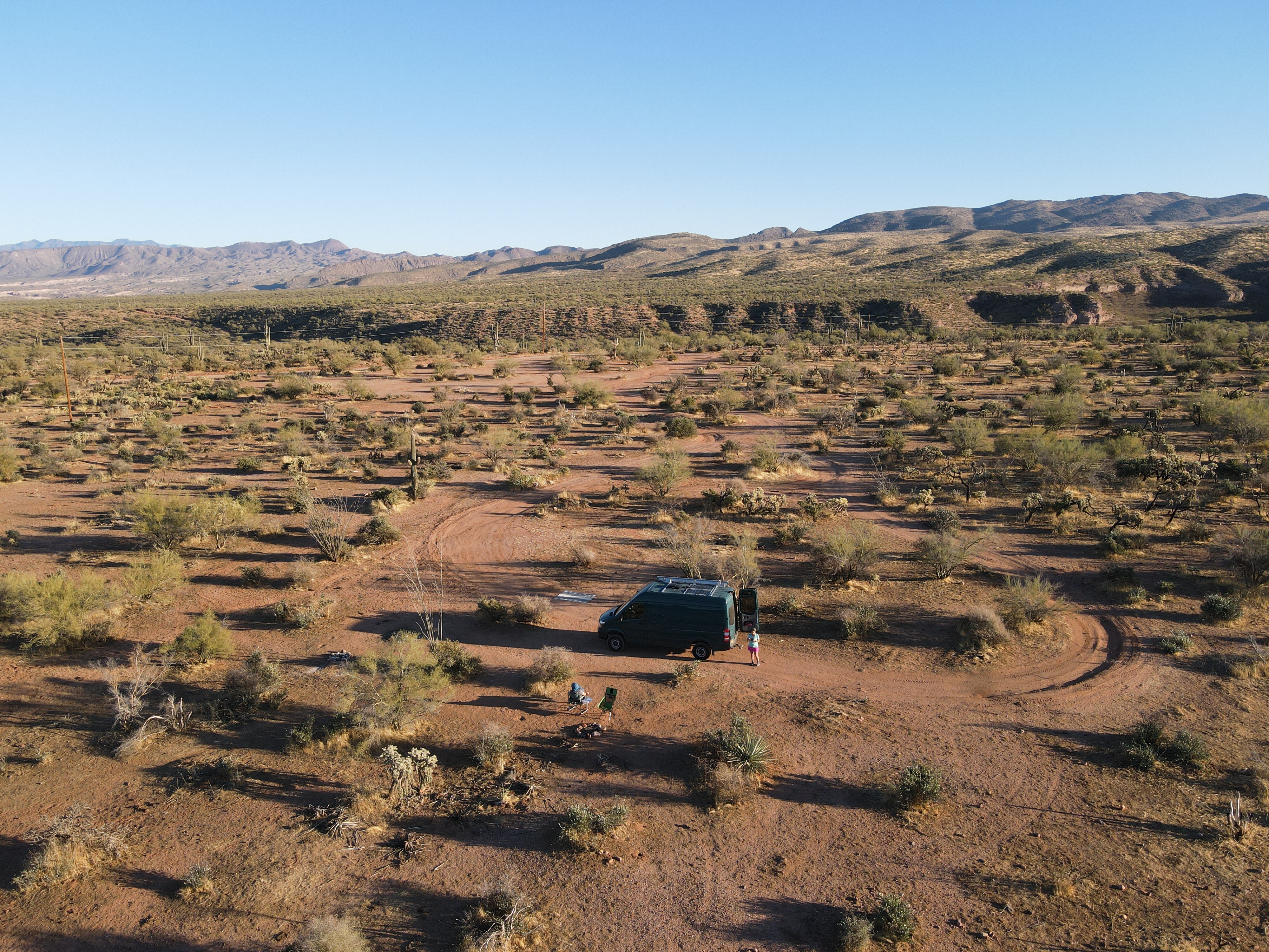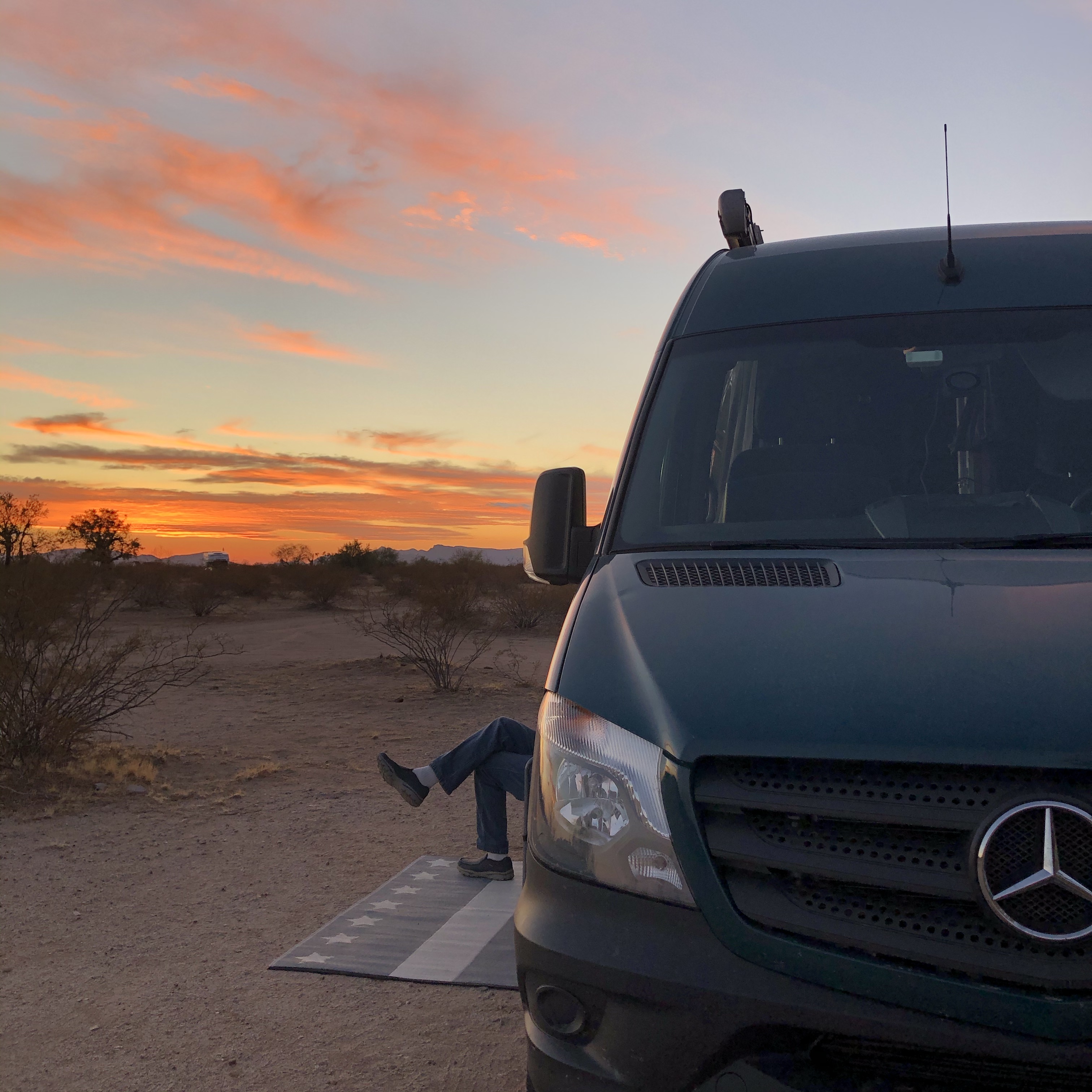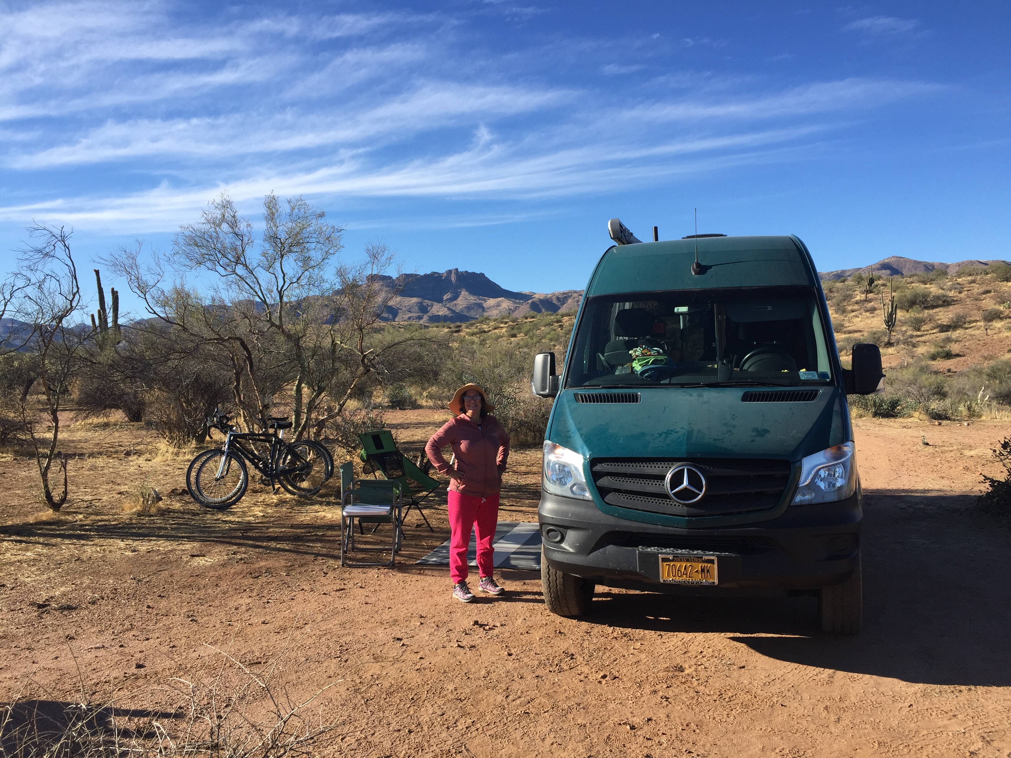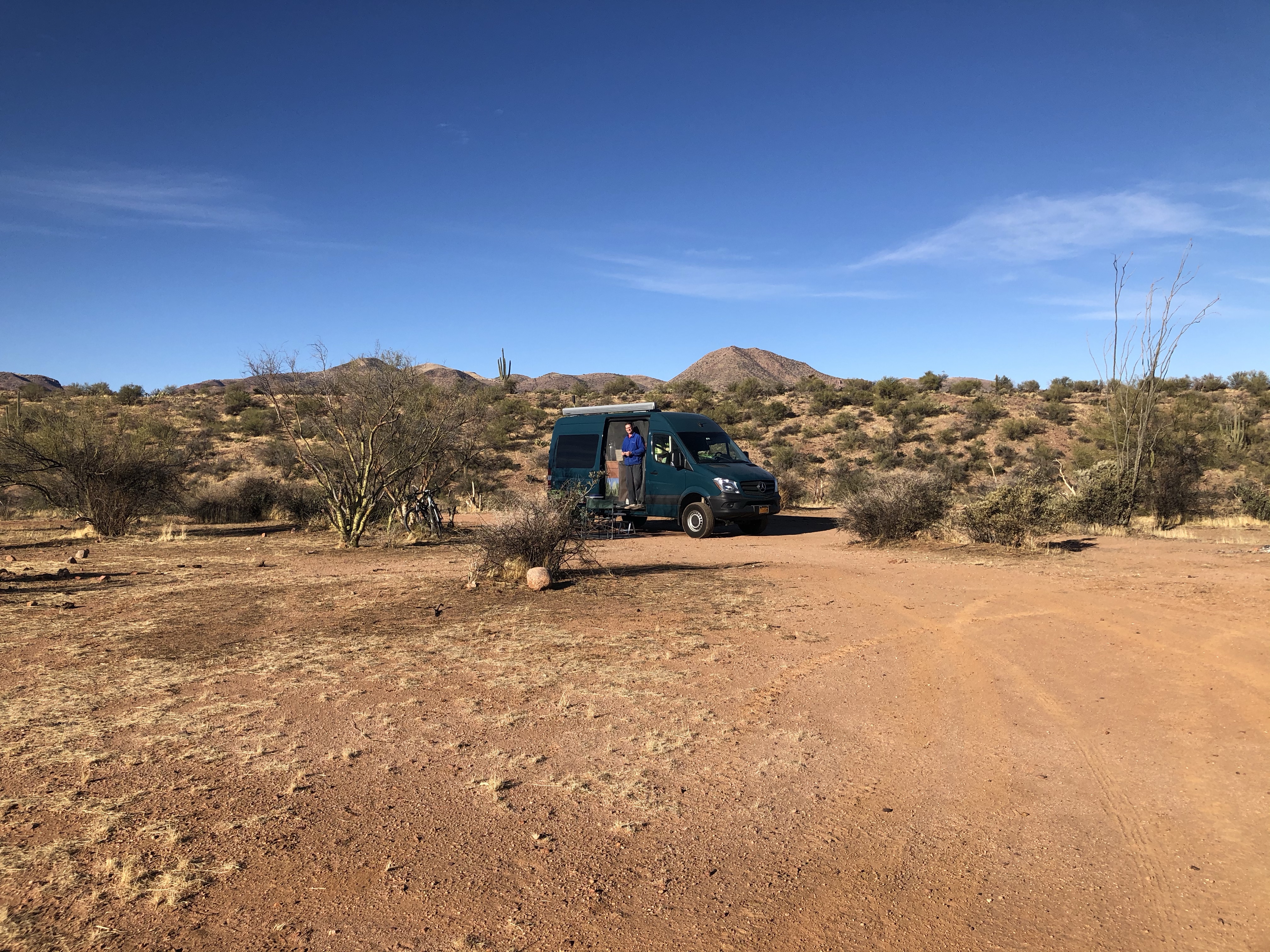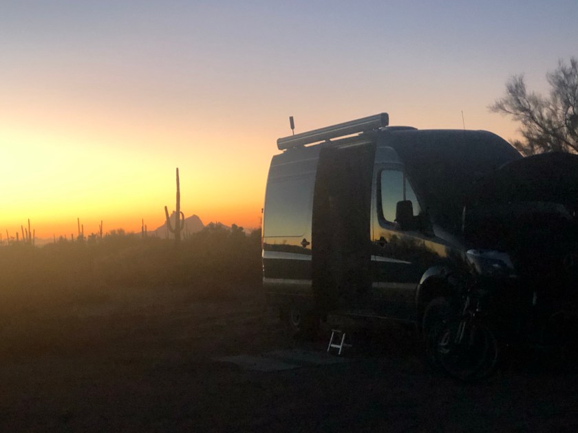 Desert Camping has its good points and bad points. This is our first time doing this kind of remote wilderness camping in the desert. We love it! The scenery is absolutely amazing, specifically the sunsets and sunrises. The parts we don’t live are the cold and windy nights and mornings and the dust!! Dust everywhere!! The van is covered inside and out with dust. Oh and the thorns. So many thorns. Always have to be careful where you are stepping. We haven’t seen any snakes or scorpions or tarantulas yet but there are lots and lots of holes in the desert and who knows who is living down these holes. Again, it’s important to watch where you step. The wind also forces me to cook inside the van which really wasn’t part of the plan, however it does heat it up a little which is nice.