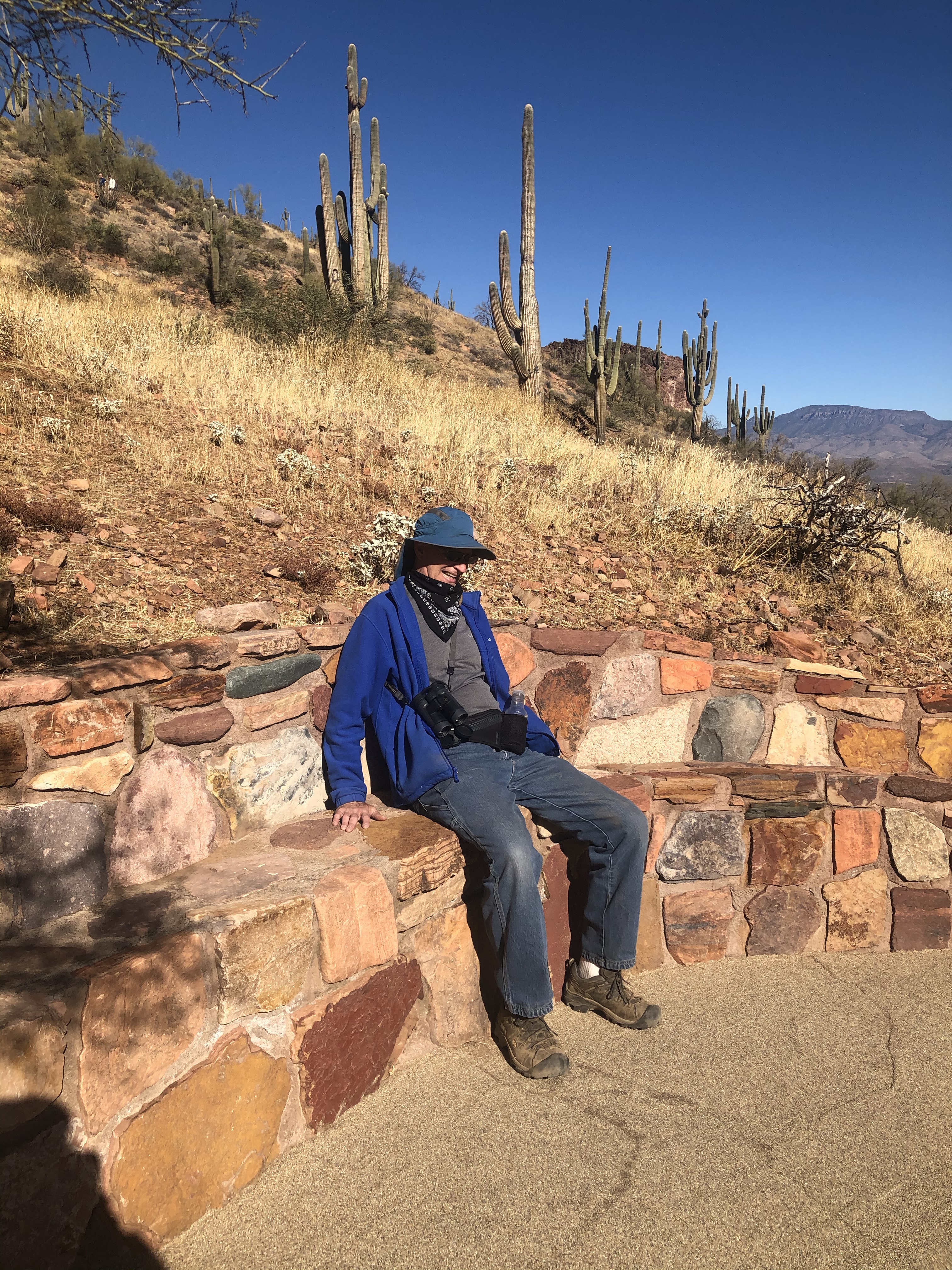 December 8. Headed back to Tucson civilization and stayed the night at another very fancy RV park with Palm Trees. I also got the rest of the color cut out of my hair. Full head of natural Gray from here on out.