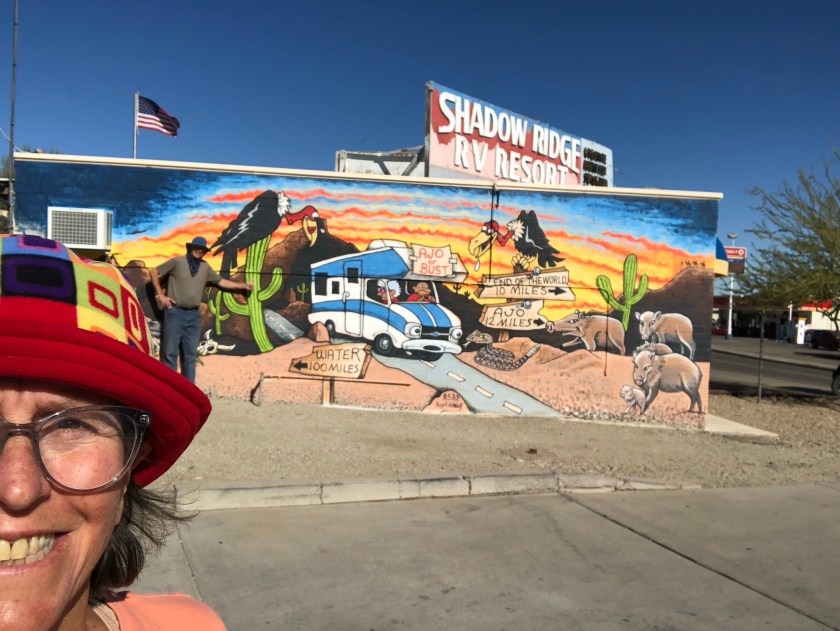 Out of the Cactus Forest for a night. Stayed in a cute town called Ajo. A Roadside Taco stand across from the RV park was AMAZING and then we also ate dinner out as well. Plus a great shower and some restocking of food. It’s always nice to be back in civilization. Especially this morning, I was able to go to Mass (in person) and then a cute coffee shop across the street. the RV parks in this area are all booked solid with the workers that are building The wall down the road. We are very close to the border where the wall is being built. We were lucky to be able to get a spot in this RV park for the night.