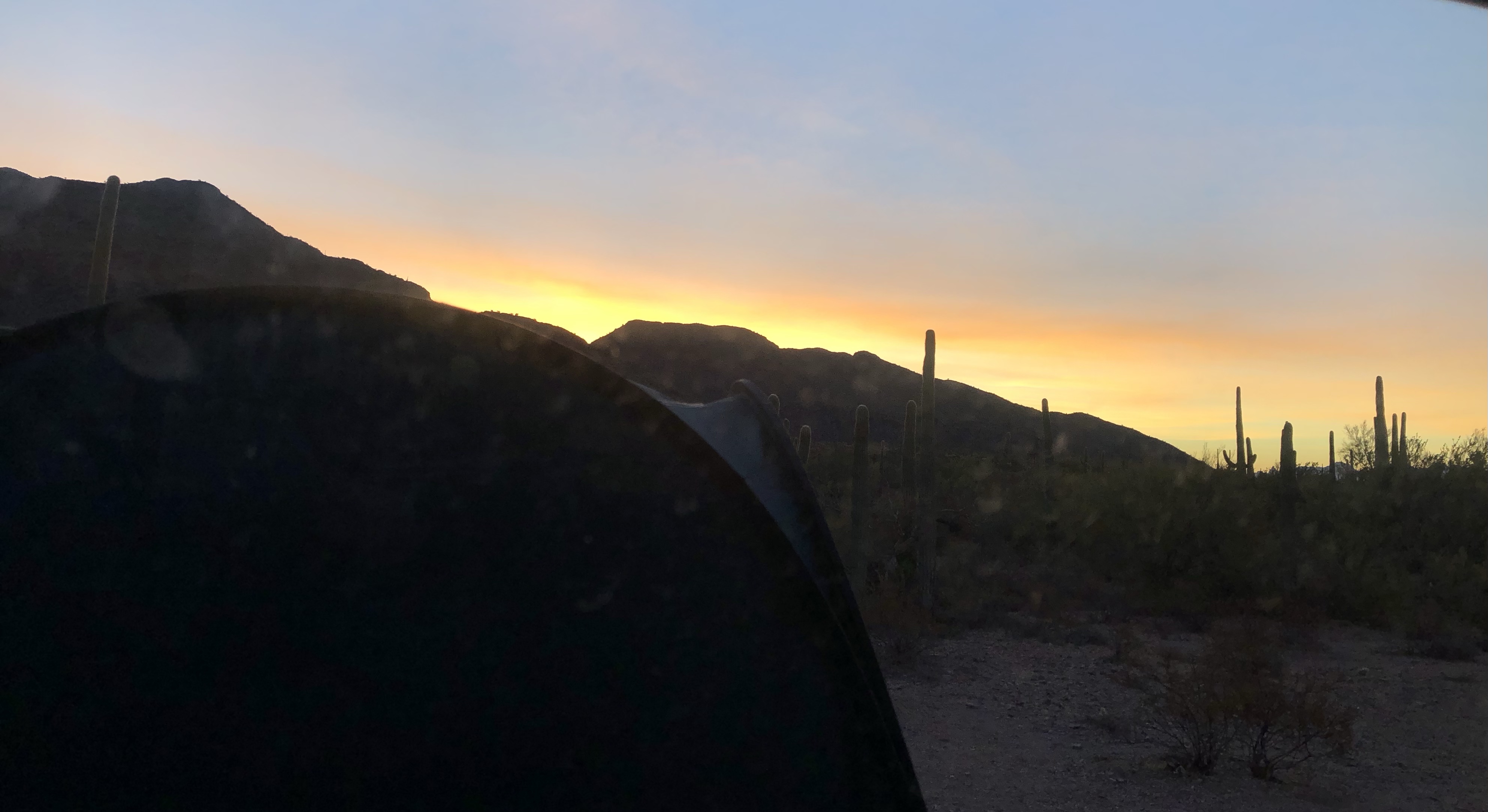 The evenings here have been pretty chilly. We either have to go into the van at sunset or have a fire. Last night we had a fire. The sky was so clear and the stars were so beautiful. The moon was just a sliver but because the sky is so dark we were able to see the whole moon lit up but the sliver a little brighter. The two planets that are going to pass each other on the 31st are getting closer and closer towards each other with each passing night. They are so easy to spot in these dark desert skies. This morning, I woke up to a beautiful Sunrise and then a Rainbow out the vans window.