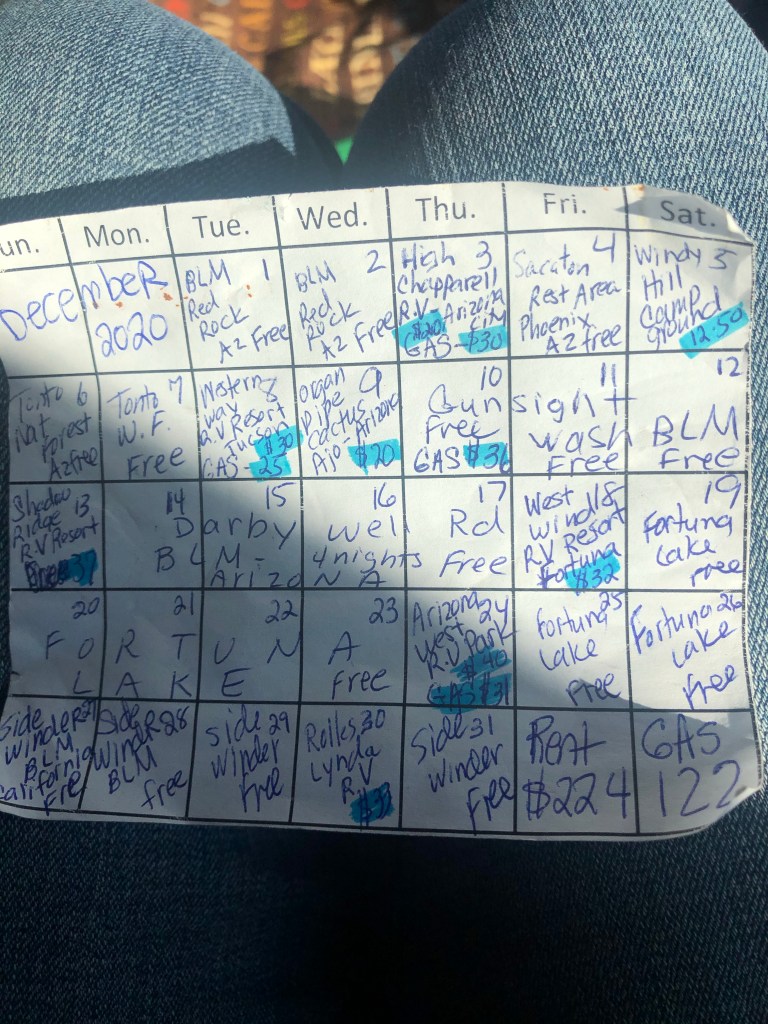 Tomorrow is New Years Eve and I’ll be sending the blog out and also adding up the fees for camping in December. I also kept track of what we paid in Diesel. I’ll post that tomorrow and then send it out. I think November we spent $153 in rent. I think less this month. I’ll have to wait till tomorrow.