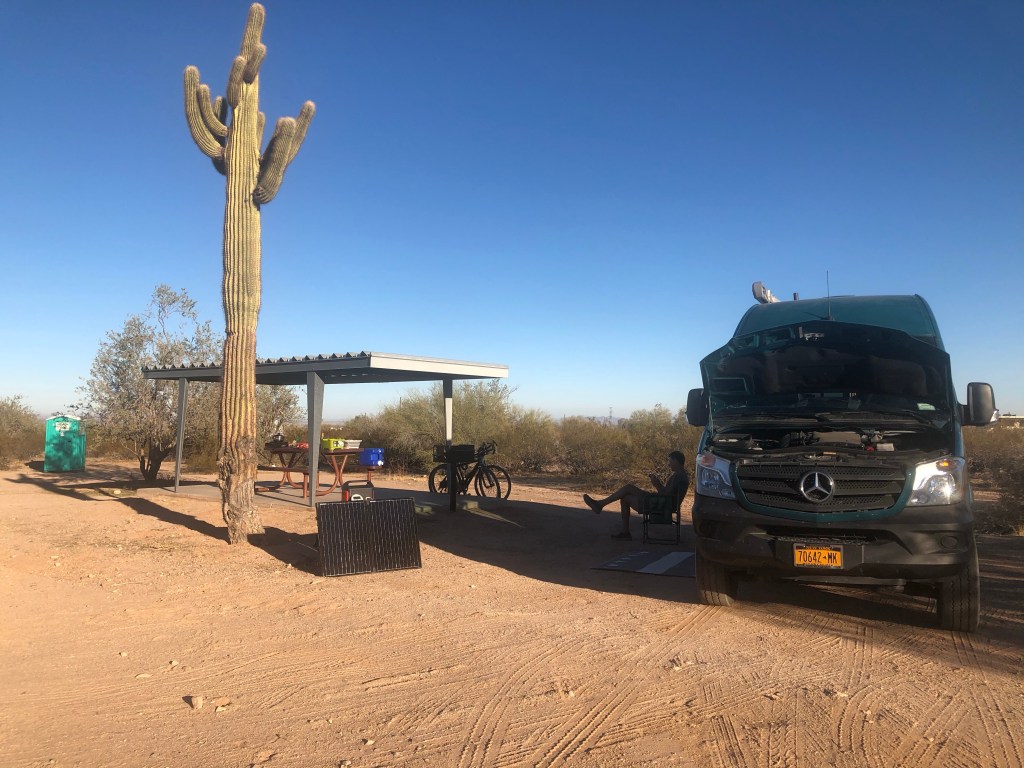 So today we decide to get out of the desert and treat ourselves to a fancy RV park in town. And by fancy, I’m talking $57 for the night. I just don’t really understand the whole attraction to this. We are ON TOP of the the people are either side of us. The sun was about to set, I had this beautiful view and along comes one of those half a million dollar RV’s. He pulls into the spot next to us which is like 6 feet from my sliding door. Like a giant wall blocking the sunset. I guess I’m pretty spoiled with all that vast land we have had to ourselves these past few months. And for free!!! All that land and space, all for free and here we sit tonight for $57 and we can hear every word and every noise coming from both sides. But we really have to take the good with the bad cause the convenience of being in town is wonderful. Taking the bikes out for dinner. Riding over to the big tent in the morning. Showers were great, a pool and hot tub and pickle ball courts. All of that stuff is nice but still I’d rather be on the free BLM land. Mostly we picked this place because they had a free RV wash area which we really really need. The dust from the desert is crazy and the van is filthy. The rv wash was right across from our spot and guess what?? It was being repaired. Out of order and on top of that an extremely loud bull dozer truck digging up the ground for most of the day. The good news is they have free baked goods and coffee in the clubhouse in the morning. Maybe that will snap me out of my grouchy, negative mood.
