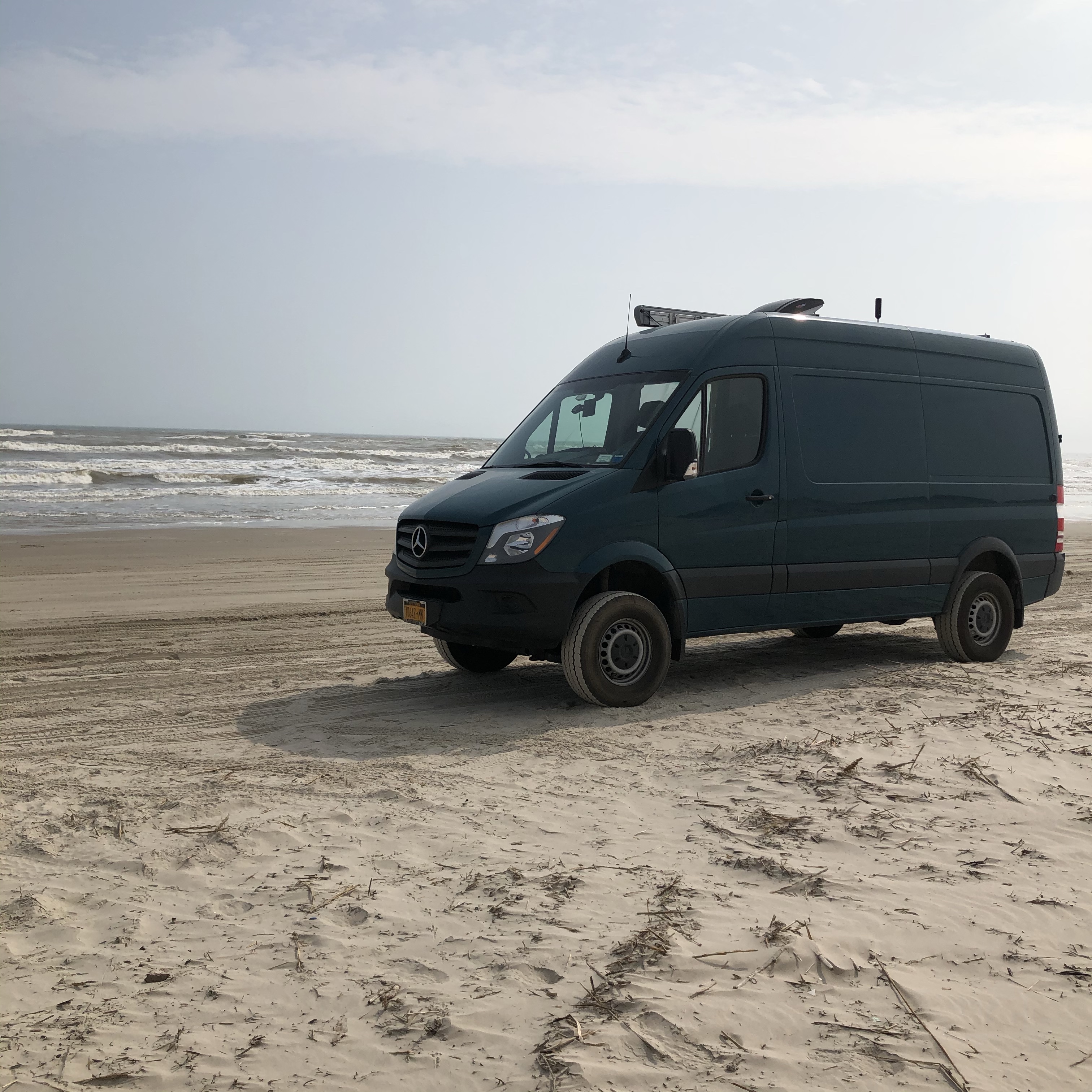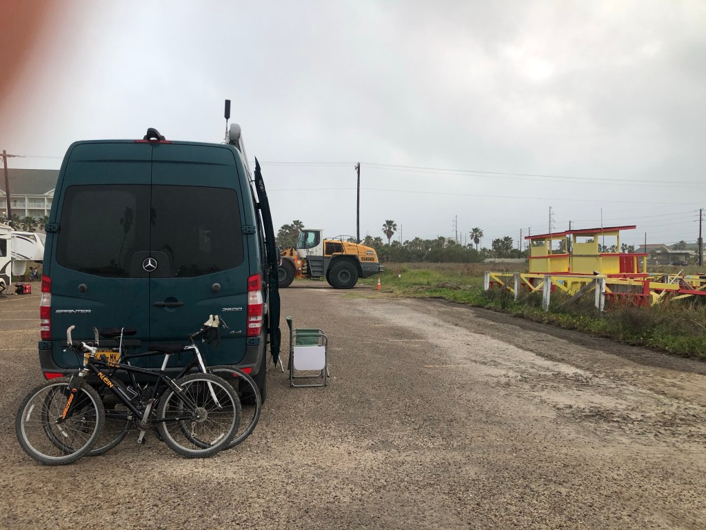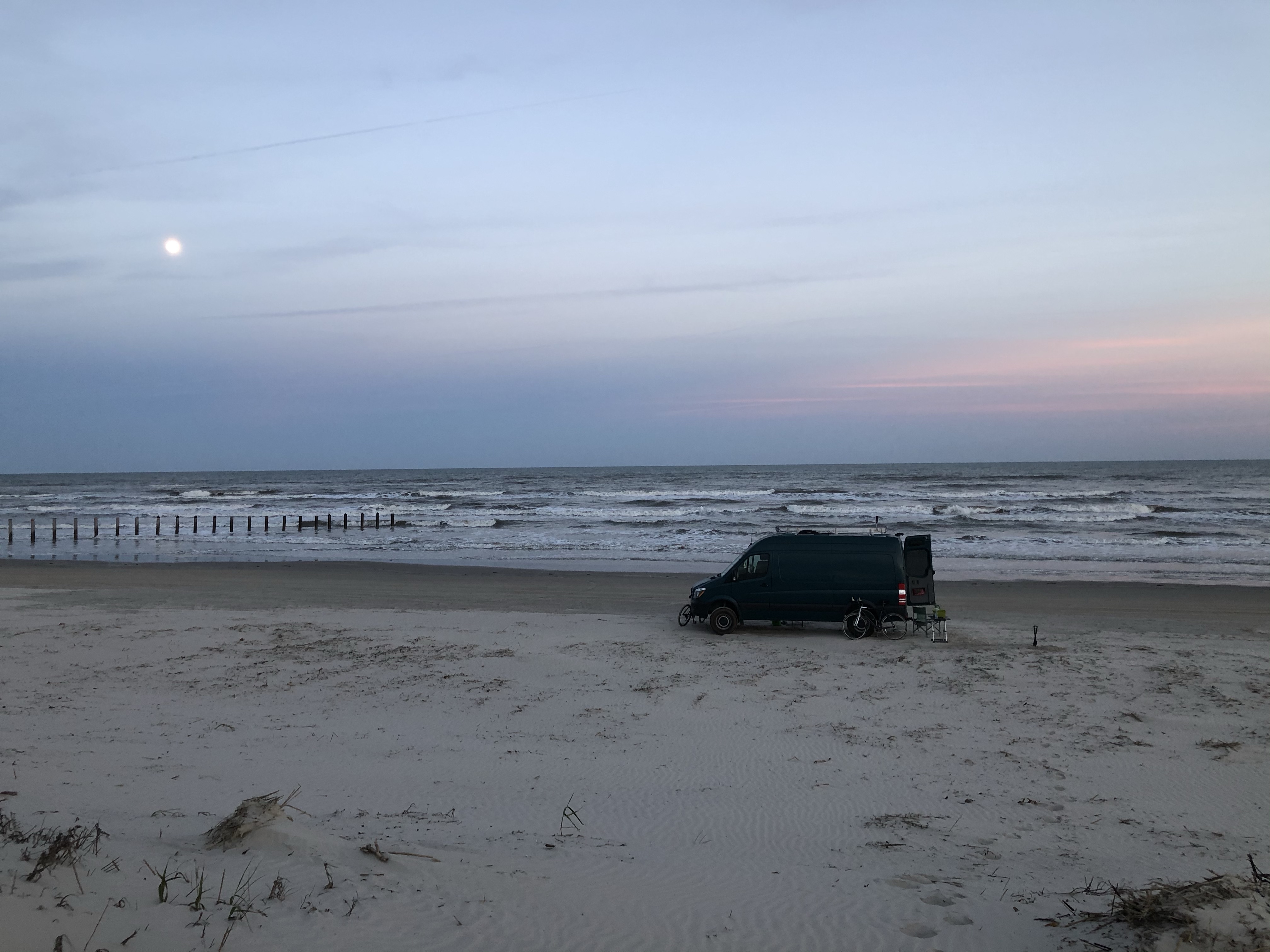 After Loves we headed to Padre Island National SeaShore where you can camp right on the beach overlooking the Gulf of Mexico. the beach was super hard packed sand like a road. We didn’t even need to air down but still put the van in 4 wheel drive. Regular cars were driving on the beach though so we knew it would be allright. We parked at the entry way and up by the dunes because we heard the hide tides came up pretty high and with the full moon it’s usually even worse. The tide came up at 5 pm and all was well. Didn’t even come within 20 feet of us so we slept well.