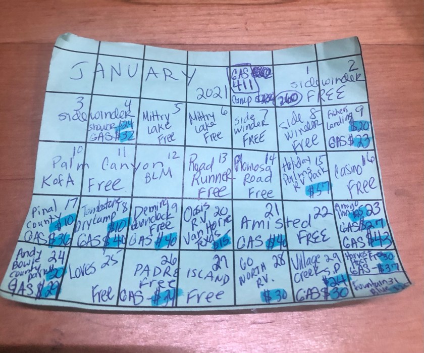 Well looks like January has come to an end. I kept track of gas and campground fees and this was a Big Month for driving. Working our way back east. Our gas bill for the month was $411 and our camping bill was $260 for the month. February is probably going to be double that as we make our way towards Florida. A lot of pricey campgrounds there and not much public land.