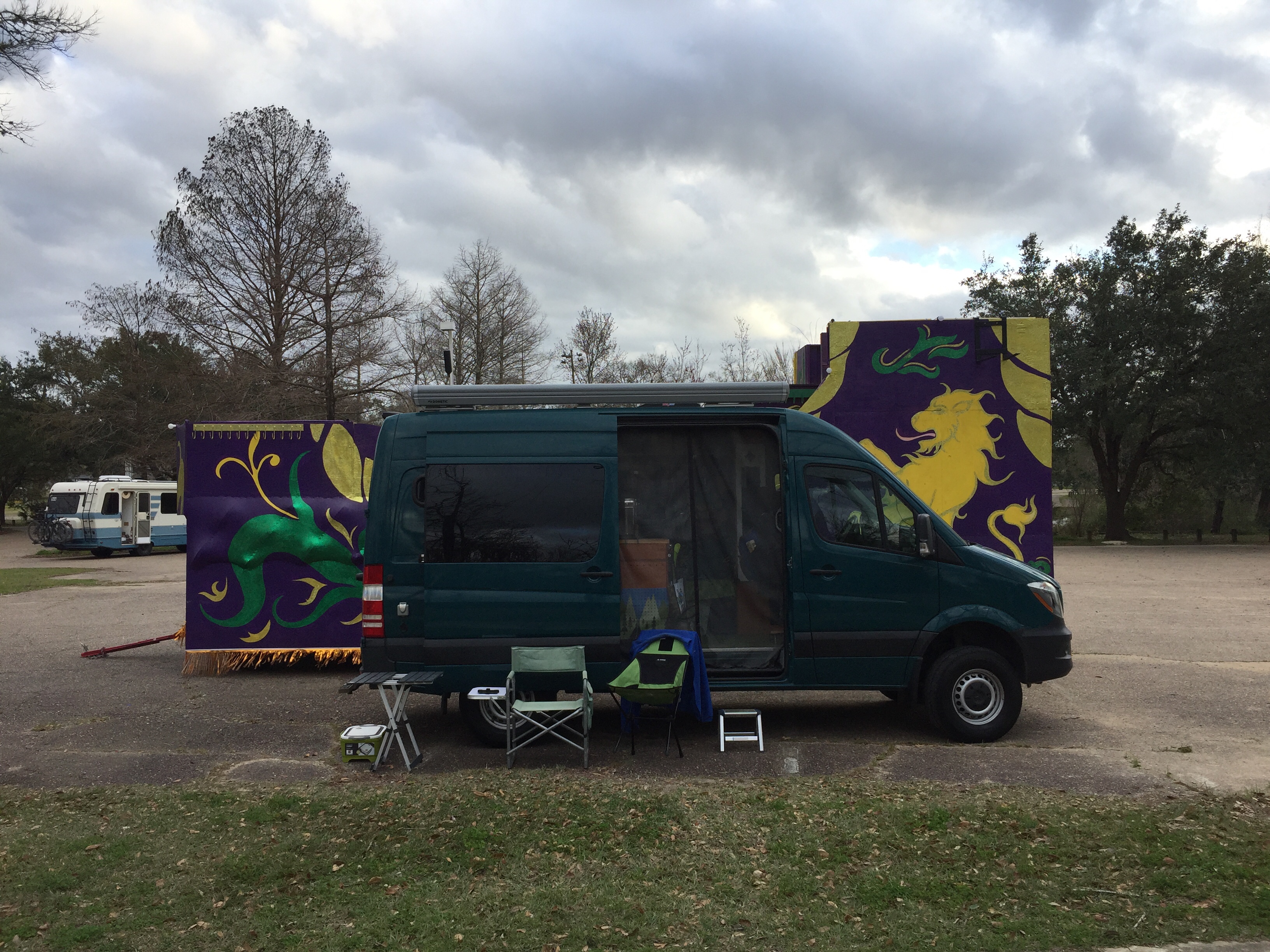 Next day headed another three hours to a Harvest Host spot which was on the grounds of the Vermilionville Historic Village. We took the self guided tour and it was really good. Learned a lot about Louisiana history. we toured a bunch of restored historic homes and then at 4, they closed and we camped in their lot next to a Mardi Gra float overlooking a river. It was a great spot. There also was a bike path that we took and went and got some icecream in town.