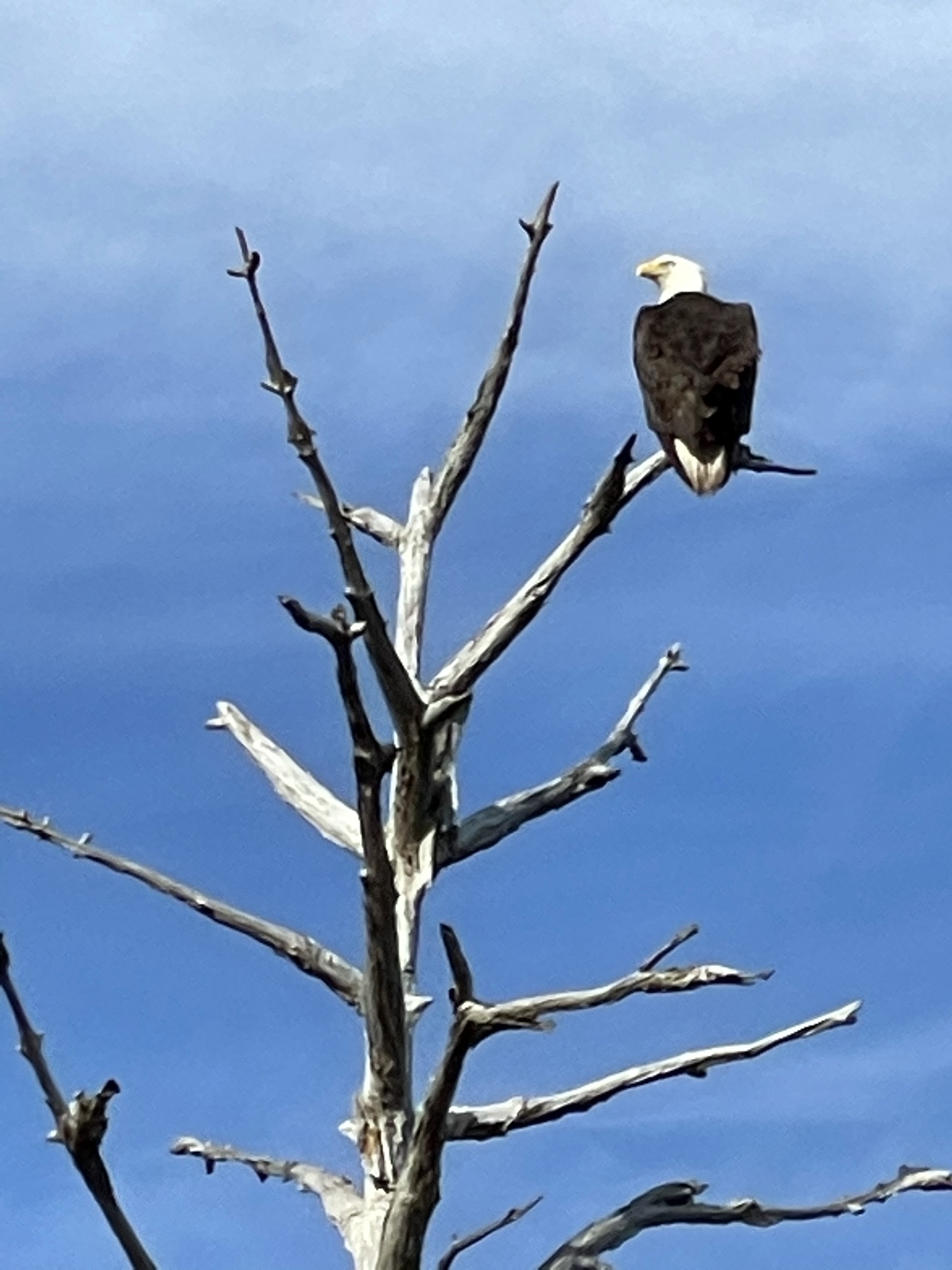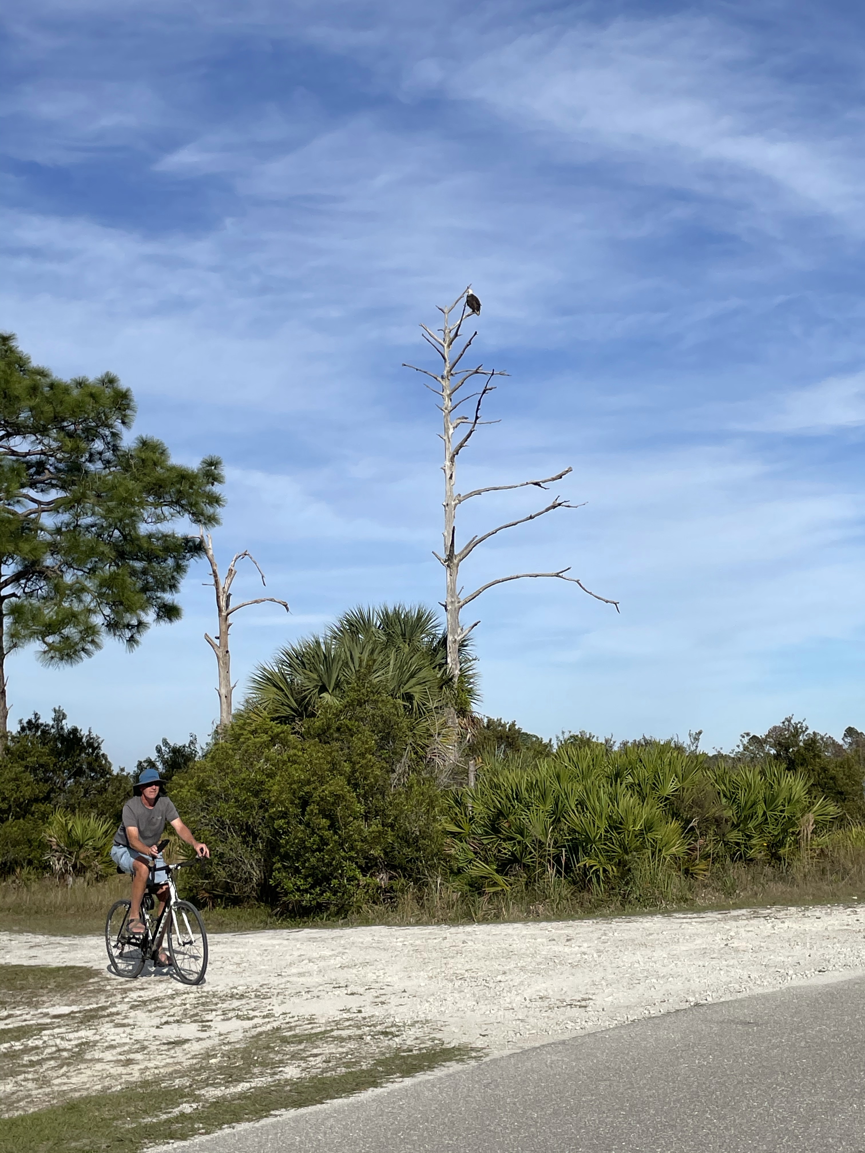 This place is great. Lots of trails to keep us busy and so many birds. On our hike today we saw a huge hawk with a giant fish in his talons. He landed in one of the oaks right by us and had his lunch.