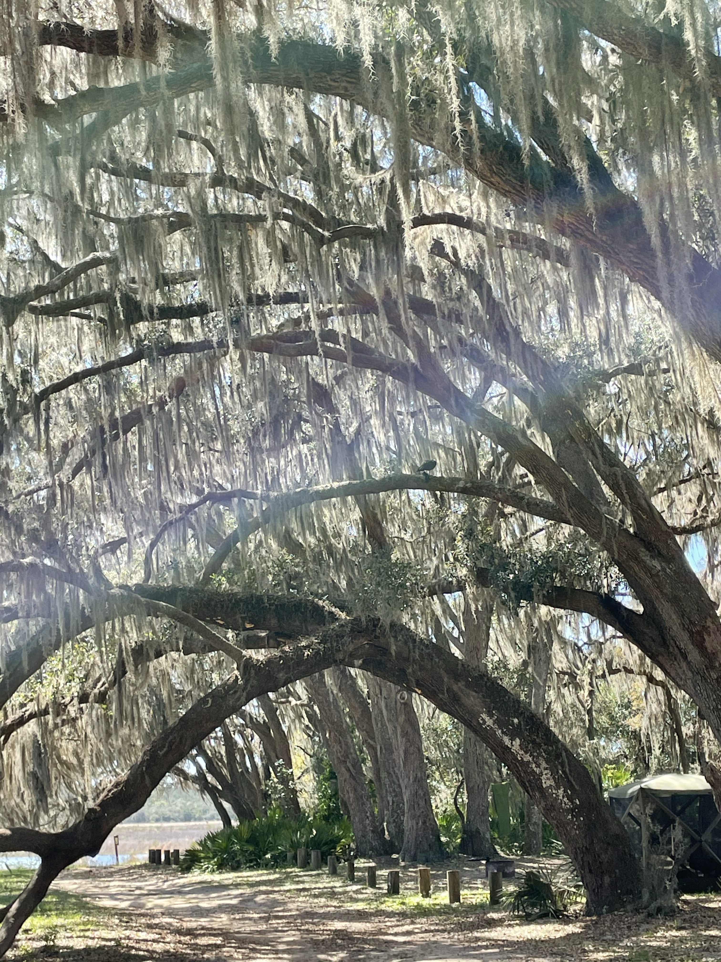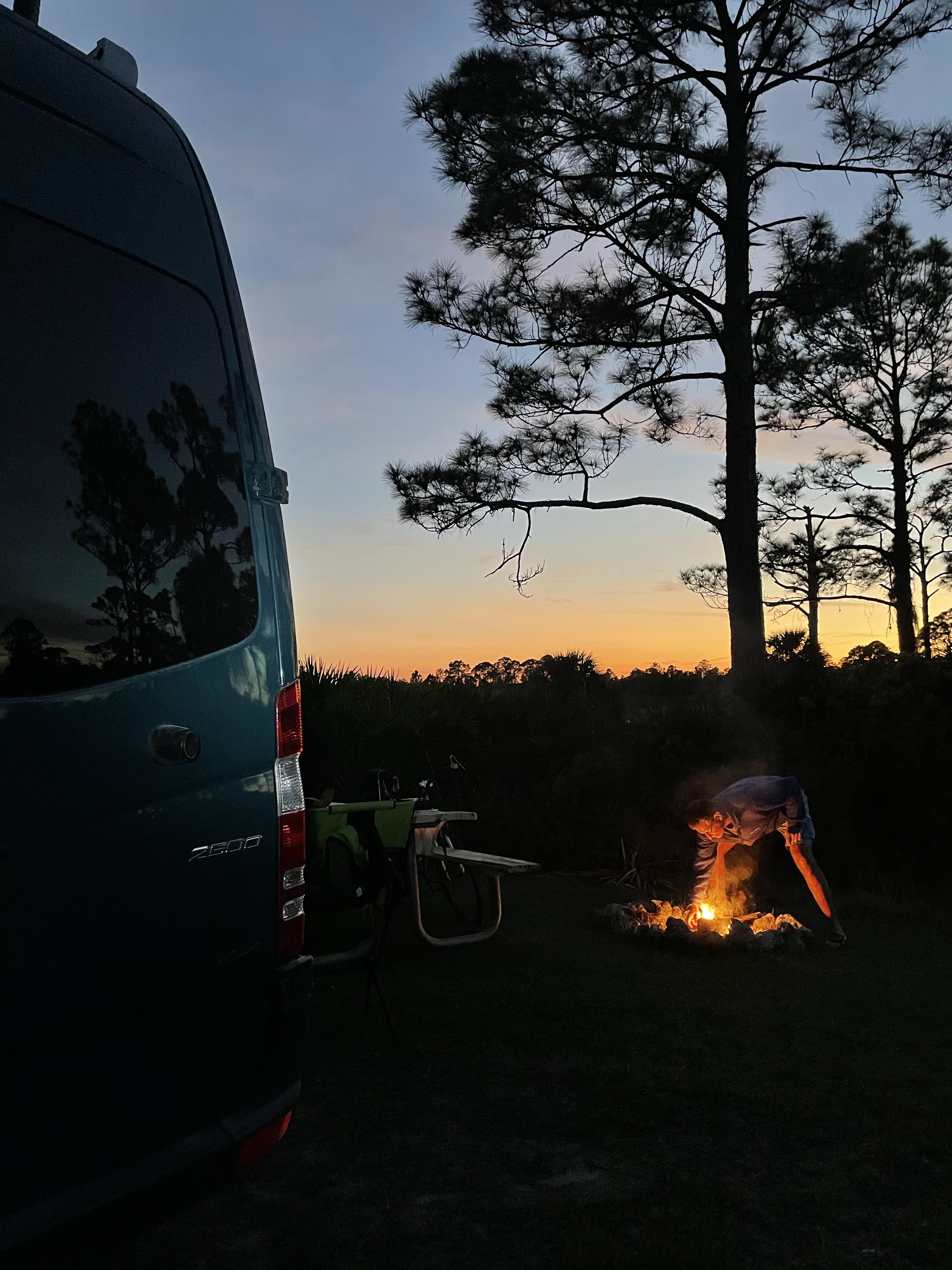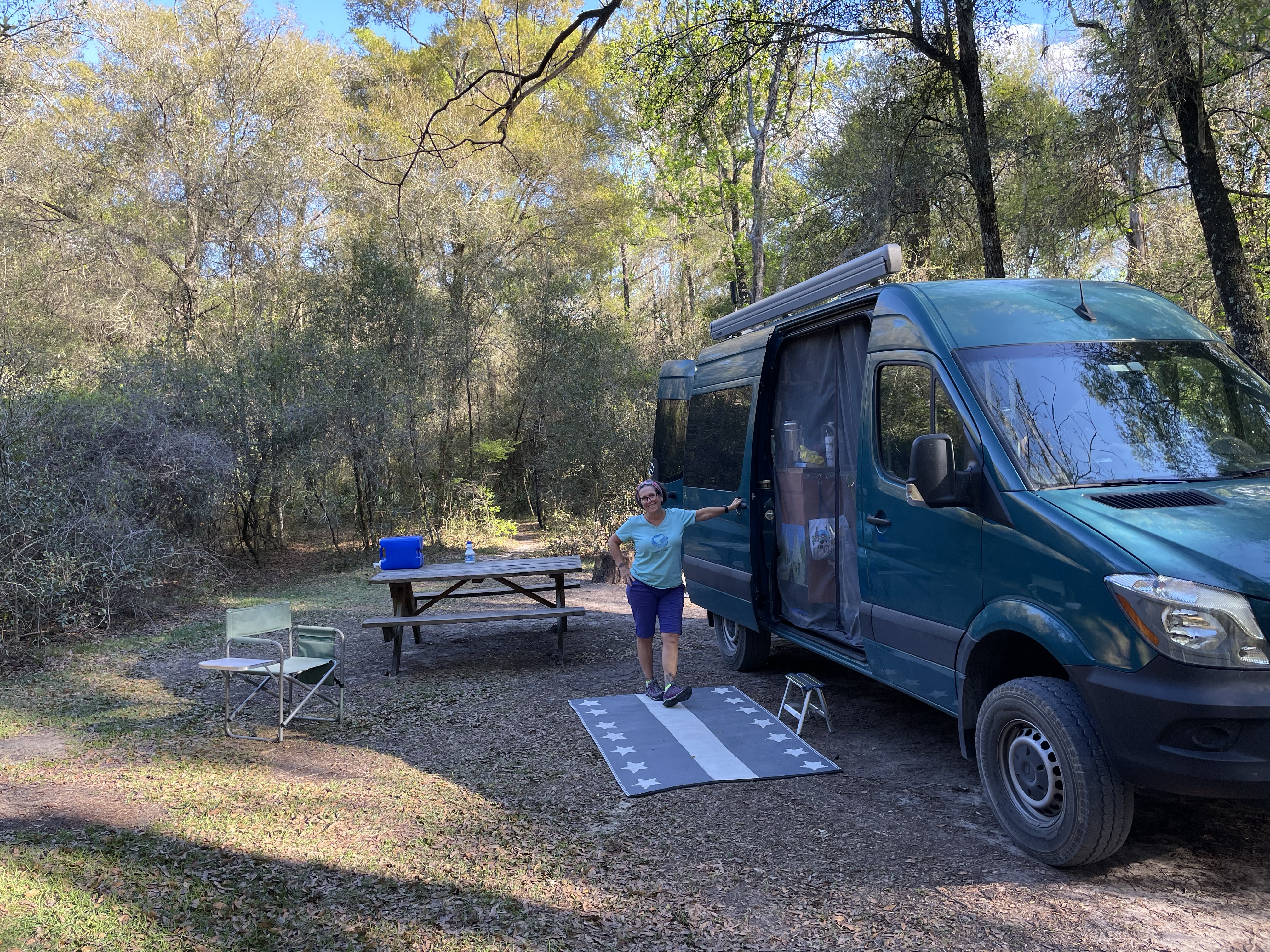 In the morning we went to another one of these springs. This one was called Salt Springs. We just paid for the day pass. It was $16 for us to go check out the park. We saw some huge fish and huge crabs swimming among the people. Kind of freaky but they seem to enjoy it. We stayed about an hour and then headed out to search the Ocala National Forest for a place to stay tonight. We had done some research last night so had a few locations that were hopefully open and available. Our first stop was at a place called Lake Eaton down a very sandy road. We put the van into four wheel drive and headed down the road only to come to a closed sign on the campground gate. There was a volunteer campground host that explained how they have been closed since March 21st of last year. They keep telling him that they are gonna be opening soon but yet he still waits. He’s been there since October. The Florida parks system have great volunteer Camp Host. This guy though has the easiest gig of them all. Anyway, he suggested Hopkin Prairie Campground which is similar to the one he hosts at. It’s off the beaten path and very primitive which is what we love. That usually means less people, less families and more space. So we took his advice and headed there. I also had added it to our map page last night after watching a YouTube video about it. It was only a half an hour drive from the closed camp. We didn’t even have to put the van in four wheel drive for this place. It was perfect!! I have a feeling we will stay here for longer than expected. We’ll see how the bugs are tonite as well as the generator’s. There’s no electric, it’s primitive camping so there’s a pretty good chance people will be blasting their generators at some point. We are totally spoiled with the solar power.