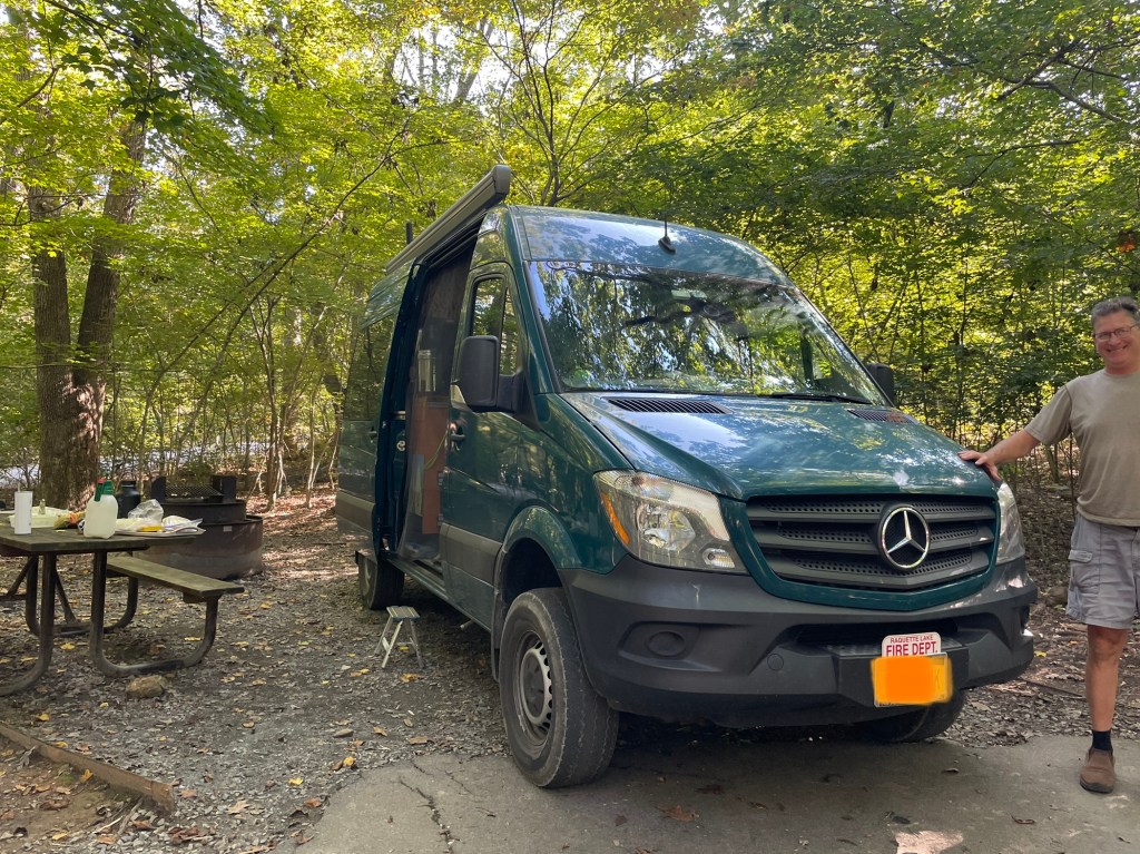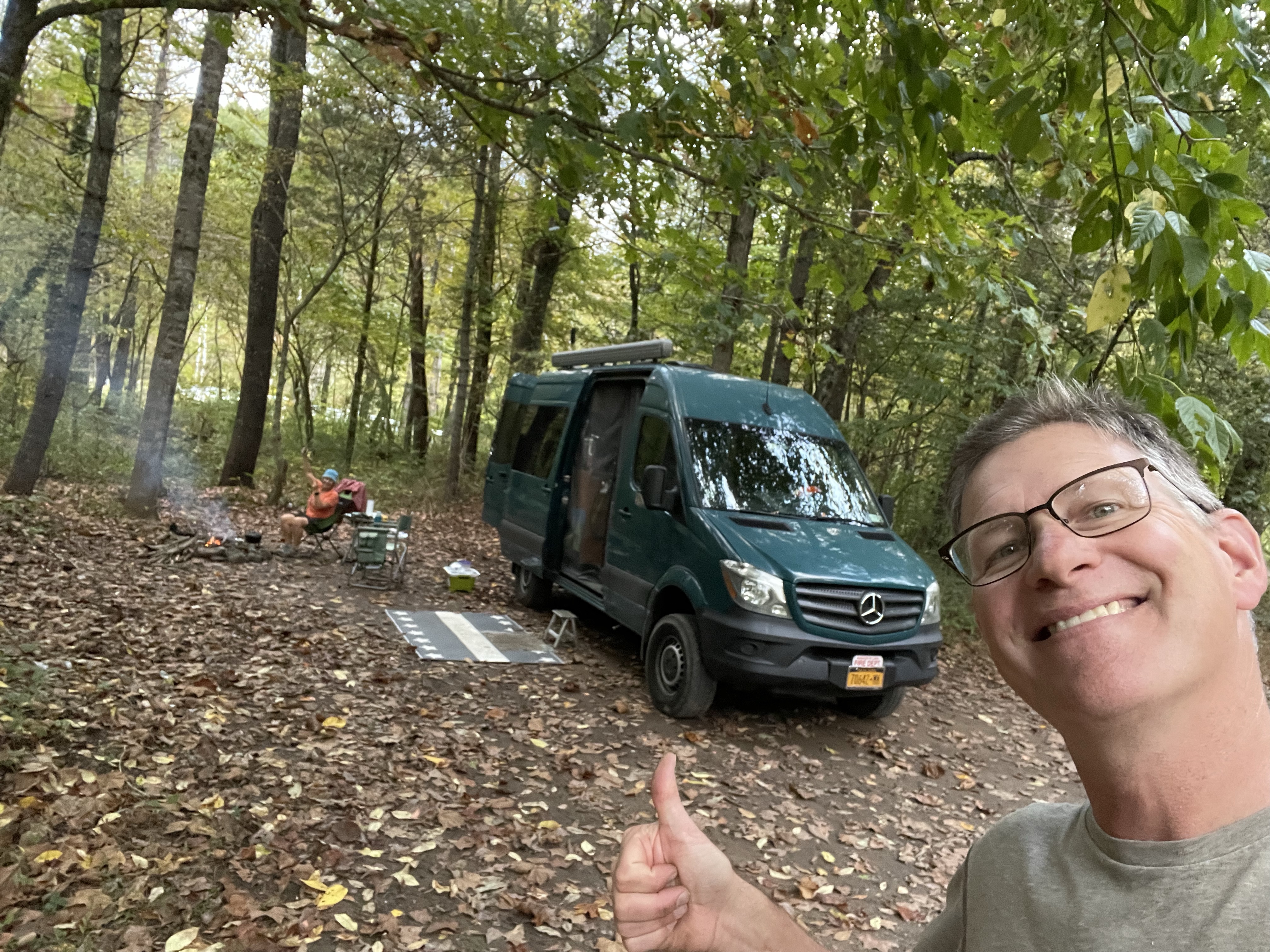We left the Expo at around 2 cause we were going to head into the mountains of Virginia to George Washington National Forest. Wanted to give ourselves plenty of time to find a spot to camp. The National Forests offer free camping which we love. It’s our favorite kind of camping. We found a small campground called Orinoco. This used to be an old CCC camp.Enough room for about 10 campers with 2 pit toilets. That a fancy word for outhouse. We found a nice spot and went searching for some firewood. There’s a nice creek behind us too which means unlimited water which is great for us as we only carry about 10 gallons of water in the van.