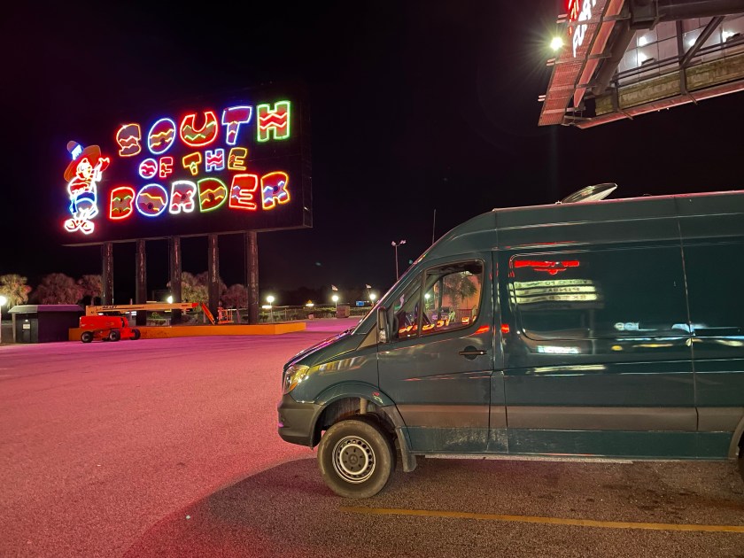 Once we got a signal on our phones, we pulled over to check the maps and see the possibilities. I noticed that “South of the Border” was about an hour away and off we went. I love the Hokeyness of the giant Pedro statues and all the neon and the giant gift shops that sell nothing that I would ever buy. It’s just a fun place to kill time and spend the night. Back in the day, this place was a pretty exciting pit stop between New York and Florida. Today it seems pretty run down. Still enjoyable but definitely run down.