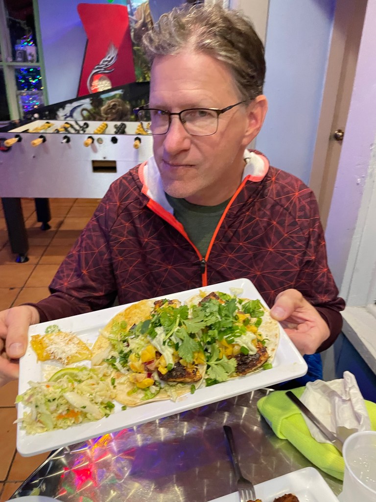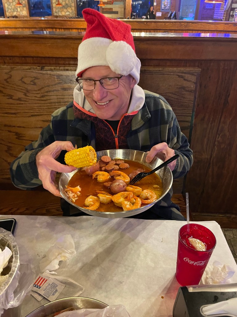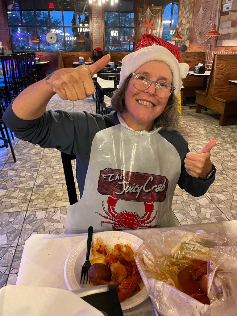 From there we drove in toward Jacksonville. The weather was crappy and cold so we were hoping to go see a movie. That was a bust as there were no theaters on the route so we stopped instead and had a nice shrimp and crawfish boil at a The Juicy Crab Restaurant. It was really good. Then we fake shopped in all the stores in that area. We drove 6 minutes down the road and decided to spend the night at the Loves Travel Center. Our original plan was to spend the night at a State Park on the beach but the weather was miserable and we would have only had an hour of daylight so that’s how we wound up at the Loves.