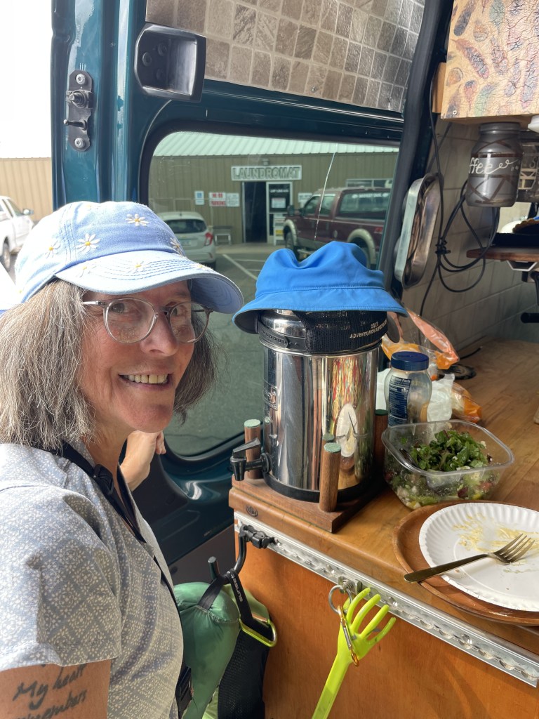 Soon after, we headed to the town so that Greg could take a shower at the laundromat. While he was showering, I did a little shopping in the local grocery store across the street. The prices weren’t too crazy considering how small the town is. The town is starting to get more and more crowded. Different events are starting to happen. Today was the first day of the WRTR, which is the Woman’s Rubber Tramp Rendezvous. I dropped Greg off at the library and headed over to listen to a few of the talks and to drop a few things off at the “free table.” You’ll never believe what I found at the Free Table. I found a brand new 12 volt water pump better than the one that died on us yesterday. I grabbed it right away and a few other things that we needed. I accidentally threw out one of our steak knives and we only had two so I picked up another at the free table. Also a fun wooded spoon/spatula that I absolutely love!