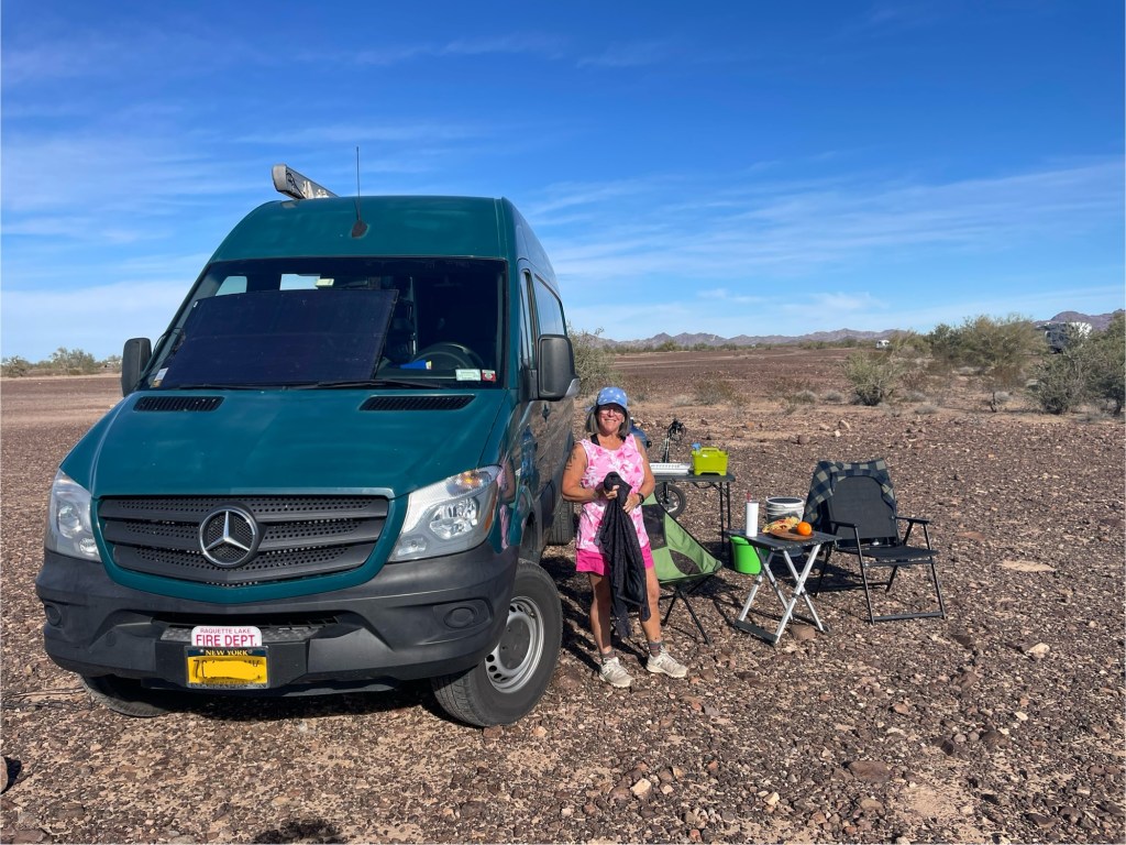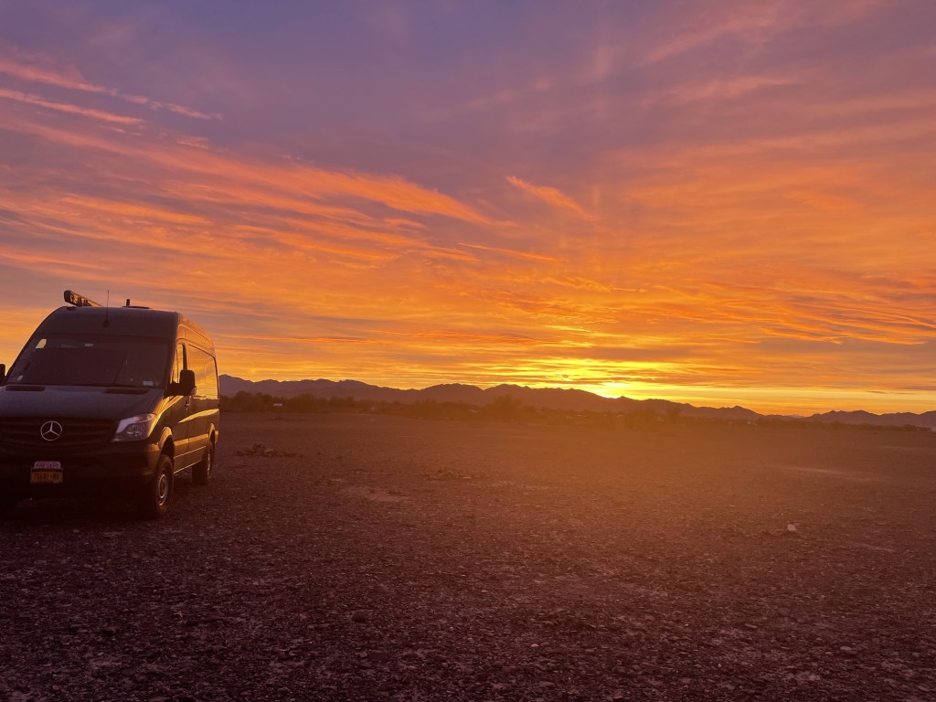 We filled up on Diesel here in Quartzsite. The price wasn’t too bad ($3.49,) however it’s biodiesel meaning it’s 5-20% biodiesel and our can is not supposed to go above 5% biodiesel. This is extremely annoying when we can not find fuel for the van. We filled it up anyhow because they say doing it once in a while is Ok. When we picked our spot I. The desert land and shut the van off, we noticed a high pitch sound coming from the engine. It lasted like 5 minutes so we googled it and found out that it is the EGR valve trying to clean the gunk out of the diesel. We watched a YouTube video on how to clean the valve and will do that if the situation gets worse. We aren’t sure if this is from the crappy diesel or just coincidence. Either way we will keep an eye on it. We plan on staying in this town for a couple of weeks so won’t be doing a whole bunch of driving.