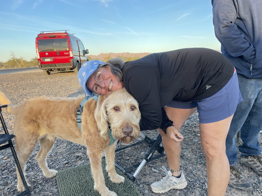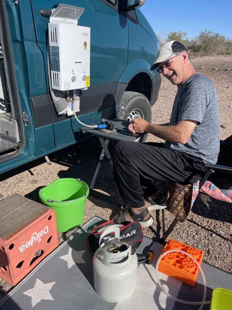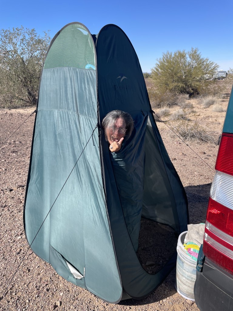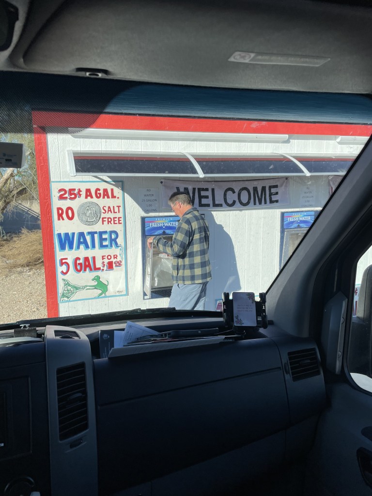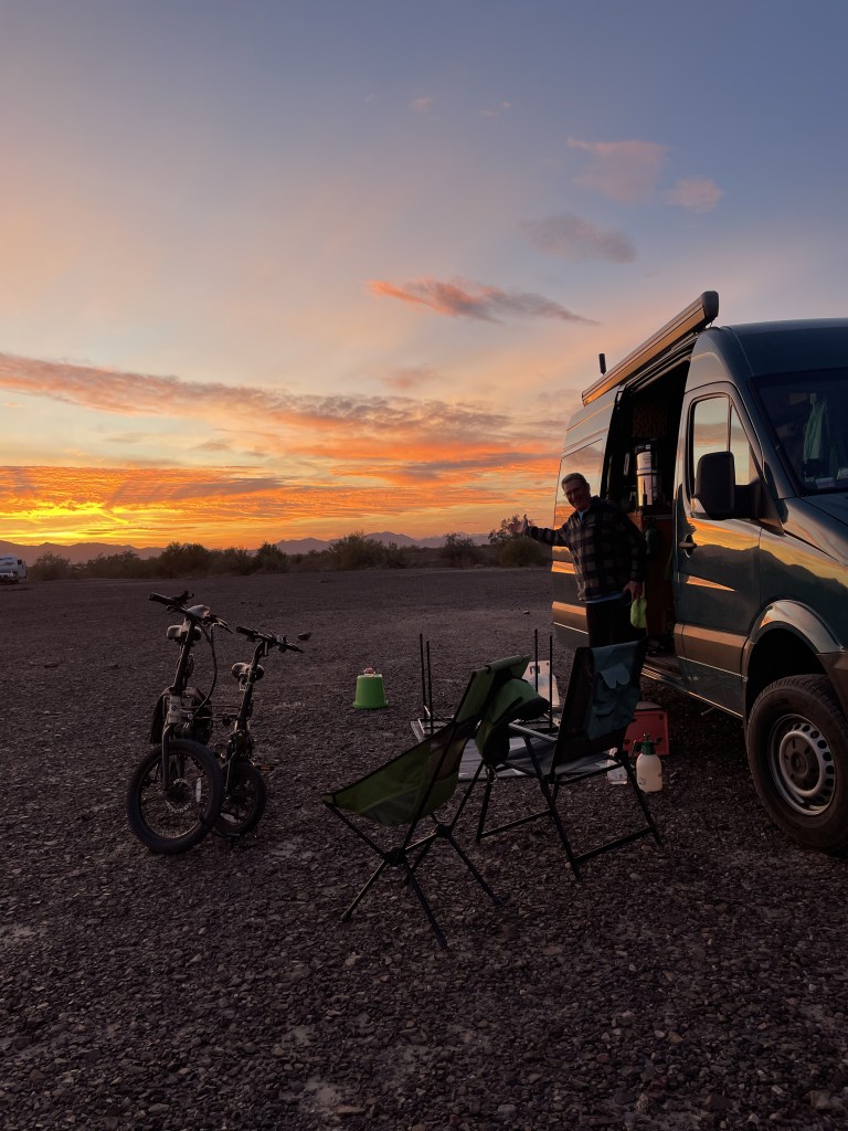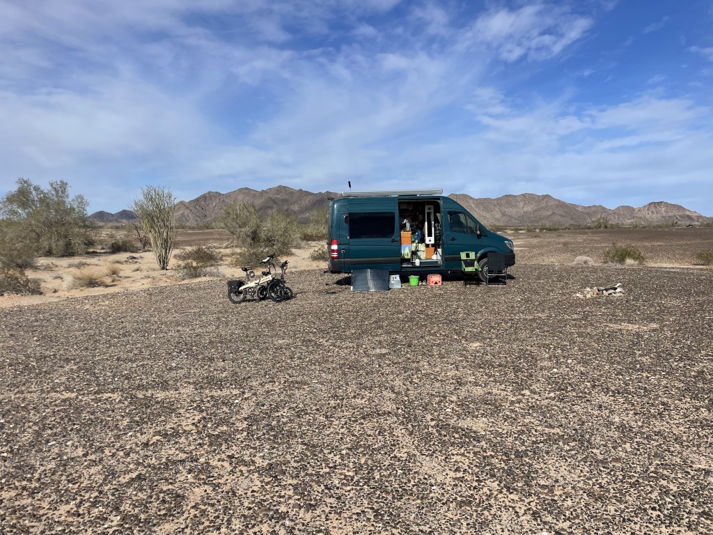 Woke up to rain!!!! Ugghhh. This time of year, the sun is so low in the sky so we aren’t getting a ton of solar to keep our battery’s as charged as we would like them. And then rain and clouds makes matters even worse. And then on top of that, it’s in the thirties at night so we need to use the Heater which draws from the Battery Bank. So our plan for staying at Plomosa Rd is no longer a plan. We need to find a place to stay for one night and plug into some electric and boost our batteries up to full force. We checked out 4 different campgrounds and then settled in at the Tyson Wells RV park which is right on I10 and absolutely nothing like what you would picture in your mind of what and RV park looks like. But for 20 bucks we get electric and we are in walking distance to all the vendor tents that are starting to set up for next weeks RV show at the BIG TENT. We will only be here one night then we had back to public land. We picked a great night because the wind was out of control and the temperature dropped to 33°. We stayed nice and cozy in the warm van. We bundled up and went to a few of the vendors.