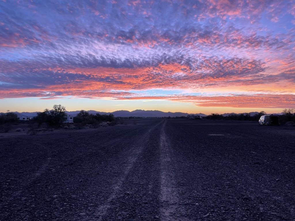 Next day we had to head to California to pick up my thyroid prescription. It was the closest pharmacy to where we are. There’s just something about California that irks me. Probably the fact that everything is twice the price of what it should be and the other being that they make you pass into an inspection station every single time you cross into California. It’s bizarre. Cause they just wave you through anyway and it’s just pointless and a waste of time and money. Anyhow we did a little food shopping after picking up the prescription and then headed back to Quartzsite. When we got back to the public land our spot that we had been staying in was taken so we drove a little further in and found a new spot and enjoyed a beautiful sunset.