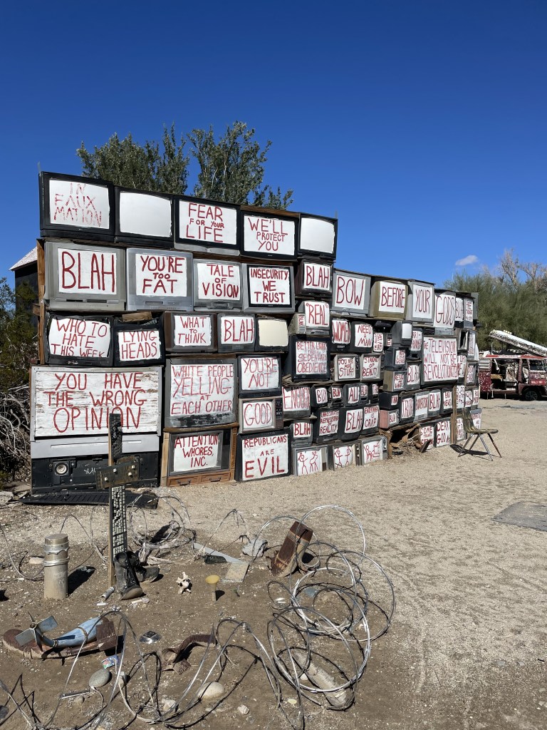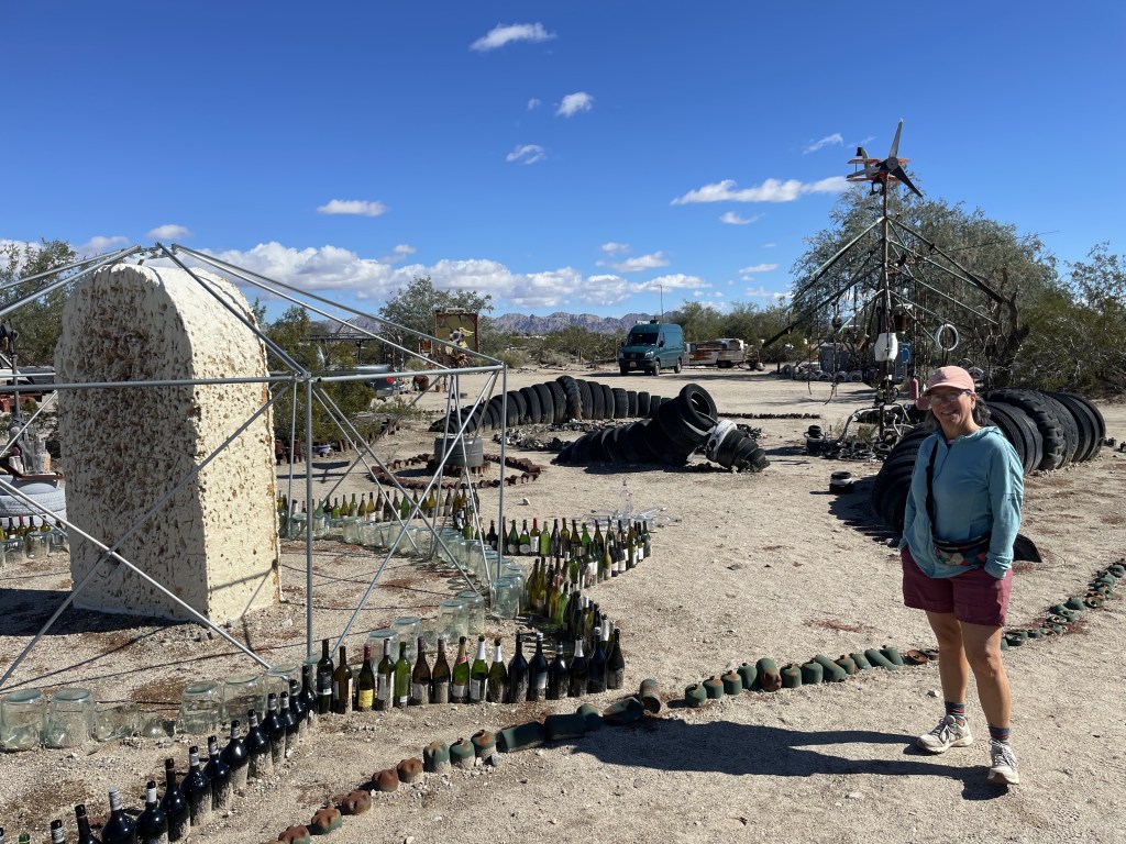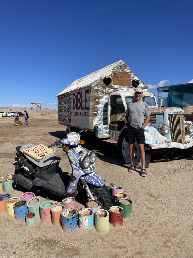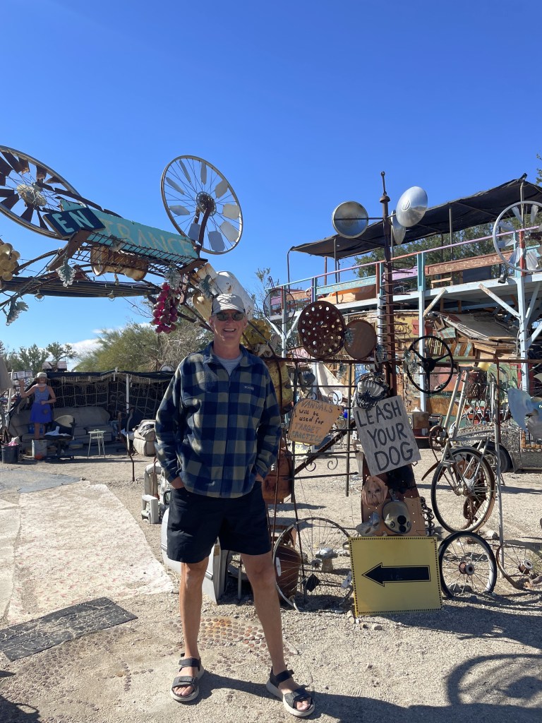 From there we headed further in past all the encampments. People have been living here for years. There’s all kinds of people here and there are no rules, no permits needed. No trash pick up, no taxes. It’s a pretty unusual place. We went to check out the art installation called East Jesus. I have no idea why it is named that as I saw no signs of Jesus in that area. Just some really unusual art sculptures. We enjoyed walking around and exploring all the artwork.