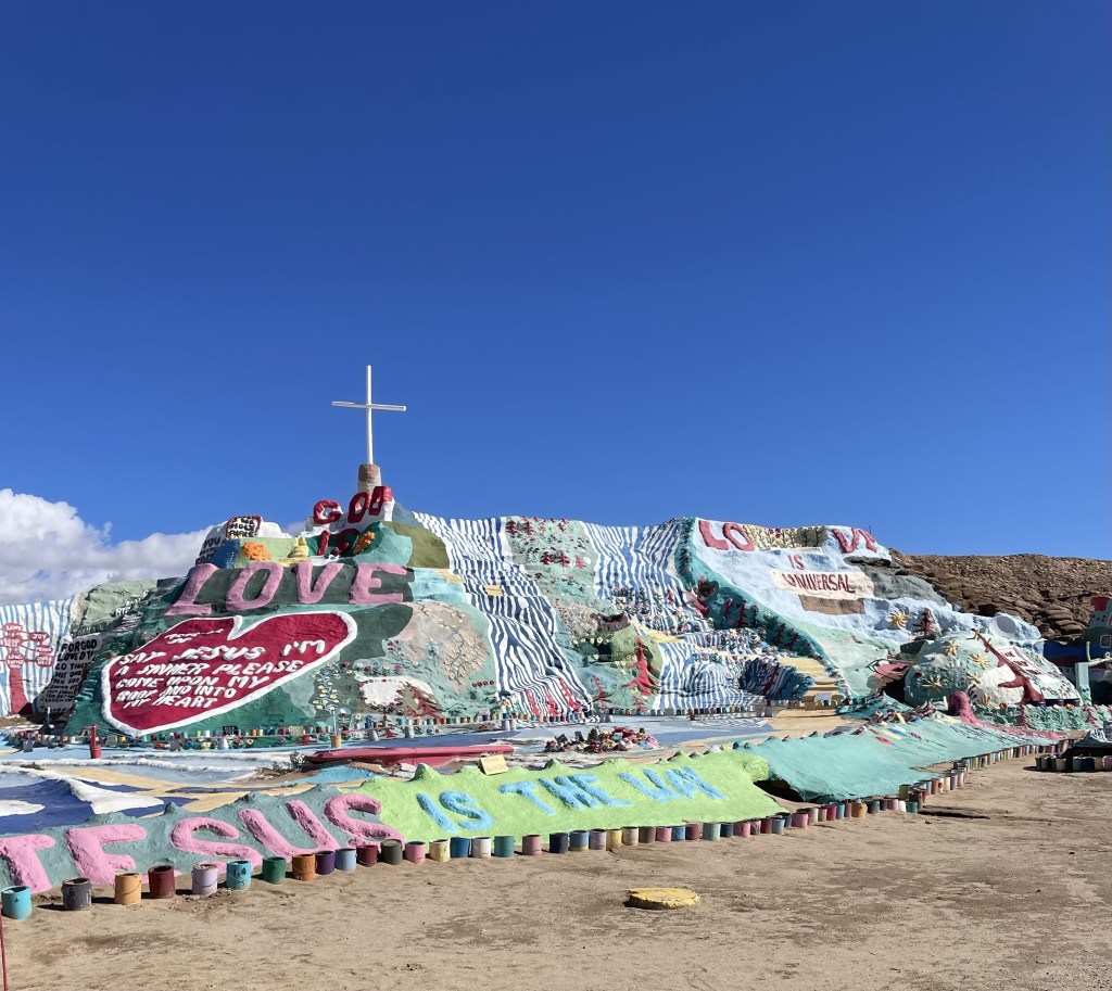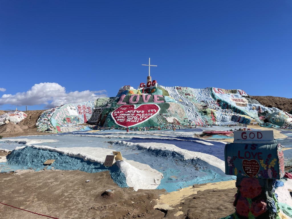 I’m so glad we stopped at Slab City on the way south. We’ve heard all kinds of opinions of the place and really just wanted to check it out ourselves. The first stop was Salvation Mountain. One guy sculpted and painted this and also lived here in that white truck. He died a few years again and the people that live in Slab City upkeep the mountain.