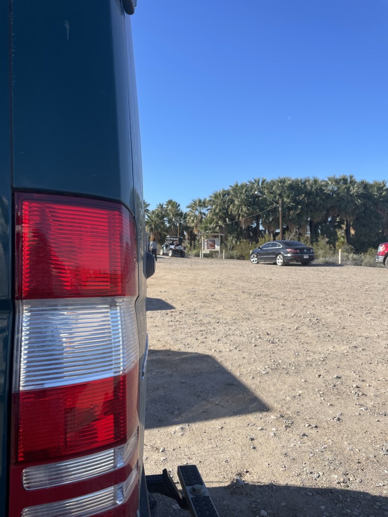 We continued further south, did some food shopping and were planning on overnighting in the Walmart Parking Lot. We were a little too early for hanging out there all day so we looked up the nearest BLM land and it was only half an hour away so we continued on. We stopped first at the Holtville Hot Spring which is a Long Term Camping Area. They charge $40 to dry camp here for two weeks and then $180 for 6 months. We have no plans to stay long term, plus the hot tub was packed with people so we headed across the highway to the regular free short term Public Land. Found a nice spot, watched a movie and went to sleep. In the morning, we woke up early and headed back to the hot spring thinking it would be not so many people but we were wrong. The parking lot was still packed and there were tons of people again. We stayed put, had breakfast, put out an extra solar panel and soaked in the sun. In the picture below, you can see all those palm trees, right in the middle of that’s the natural thermal hot springs that everyone is soaking in.