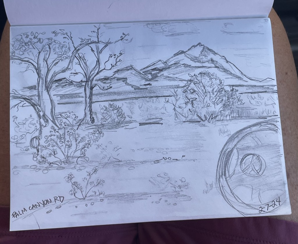 Next day we headed a little further north towards Quartzsite and settled into a spot off Palm Canyon Rd, which is right off 95. The scenery here is gorgeous and with the recent rains, it’s a lot greener than normal. We even had our very own cactus. I bought a Sketch Pad and a Sketching kit and decided to do a little sketching. I spend my mornings in the passenger seat that swivels sideways and faces the drivers side window. The views are spectacular so I decided to do a little sketching each morning.
