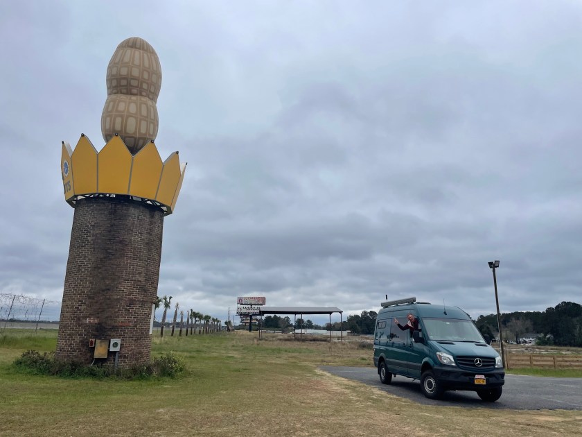 That night I entered the finish this song competition. I did not win but did a hell of an impression of Chers song, “Do you believe in life after love?” We arrived the next day in Fort Lauderdale. It’s pretty chaotic getting off a cruise ship at that port. A zillion people on the taxi line and a zillion more waiting for Ubers. while we were in line we read all the other birthday wishes that came yhrough and we listened to some great singing birthday voiucemails. We did finally grab a taxi and were on our way to get the van. Next stop Nashville. We have about a week to drive the 14 hours which works out perfectly for us since our Sweet Spot is two hours of driving per day. Our first stop was the Worlds Biggest Peanut. Next door was a sausage place. They had a huge store with every kind of sausage you can imagine. Plus tons of spices and candy and honey and barbecue sauces. It was a pretty cool store and a great way to kill time.