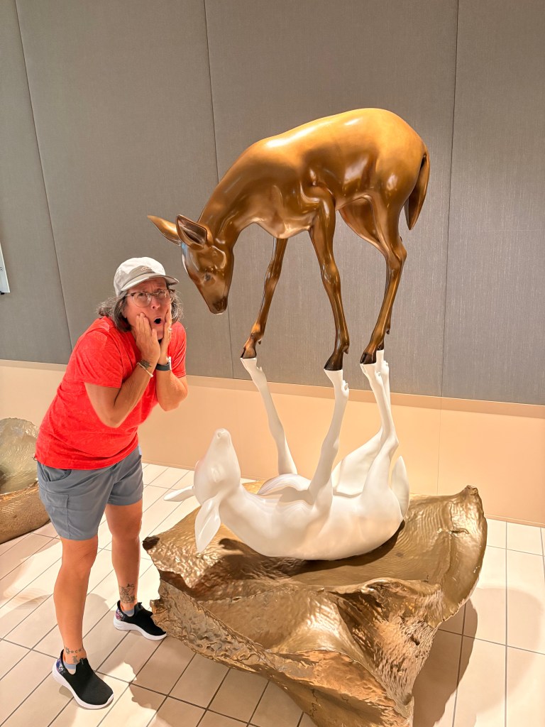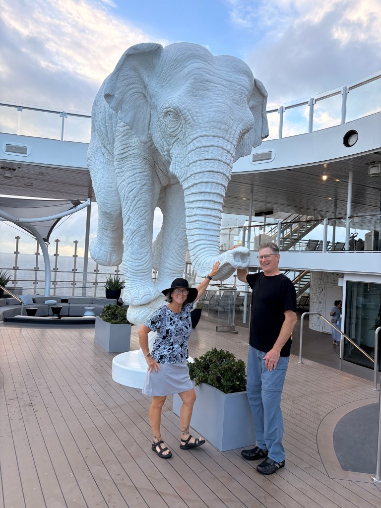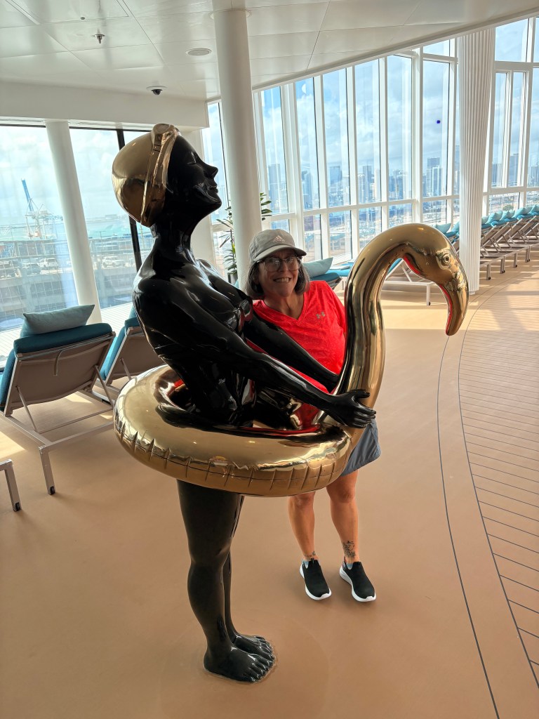 We packed our backpacks and headed to the Miami Cruise port on a 12 noon shuttle. From the time we arrived at the port to the time we set our packs down in our room was under 15 minutes. They know what they are doing in Miami at the Celebrity Port. First stop after dropping the bags off was the buffet. Of course. Then we strolled around the ship to get our bearings. This ship is absolutely beautiful. It has so many beautiful art installments all over the place.