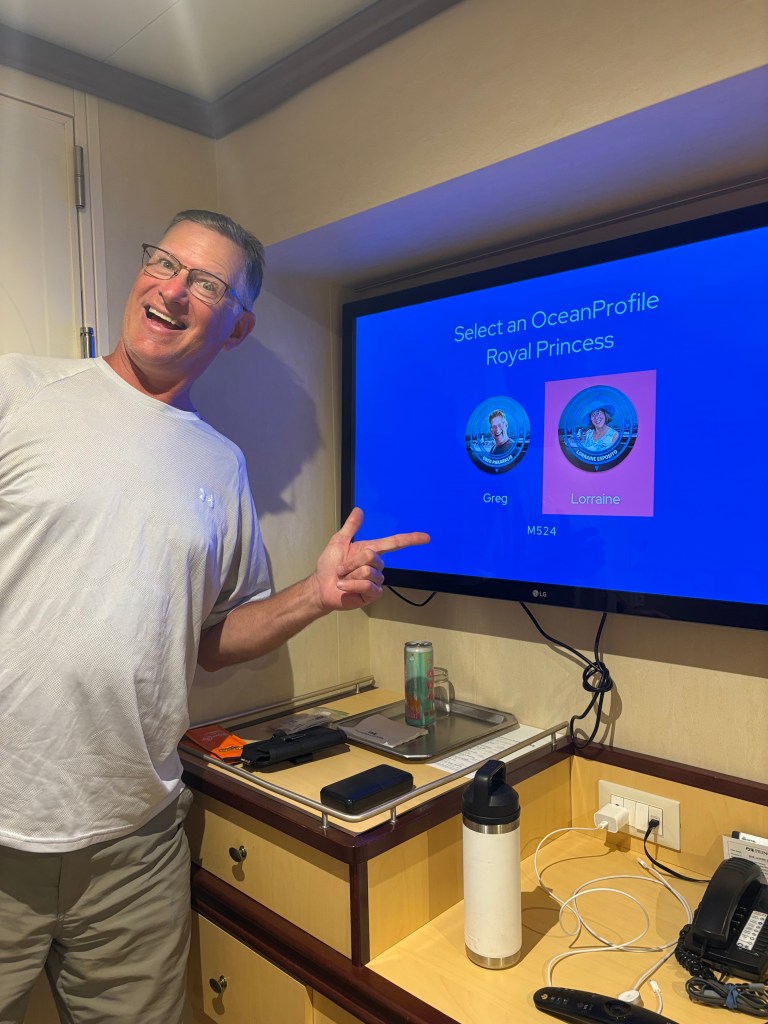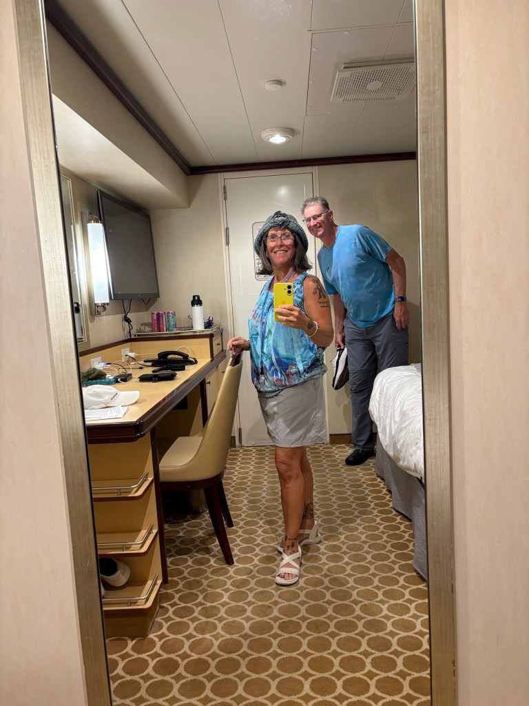 Thankfully the wind was blowing in a different direction and we weren’t smoked out of the van. We were glad for the early wake up because we both still had to pack which we did then headed out of the van and into the very long line to get onto the ship. It was an hour long line but we did finally get on and headed straight to our room on Deck 15 to unpack. The room was nice, the bathroom was the smallest of any room we have ever had.
