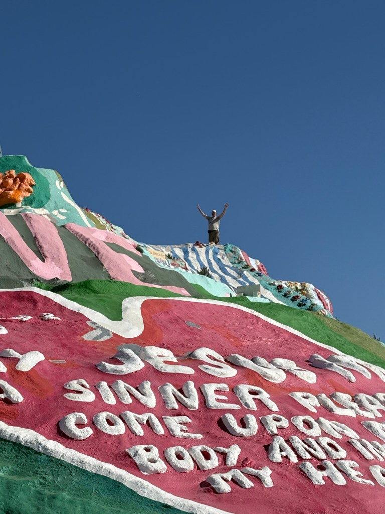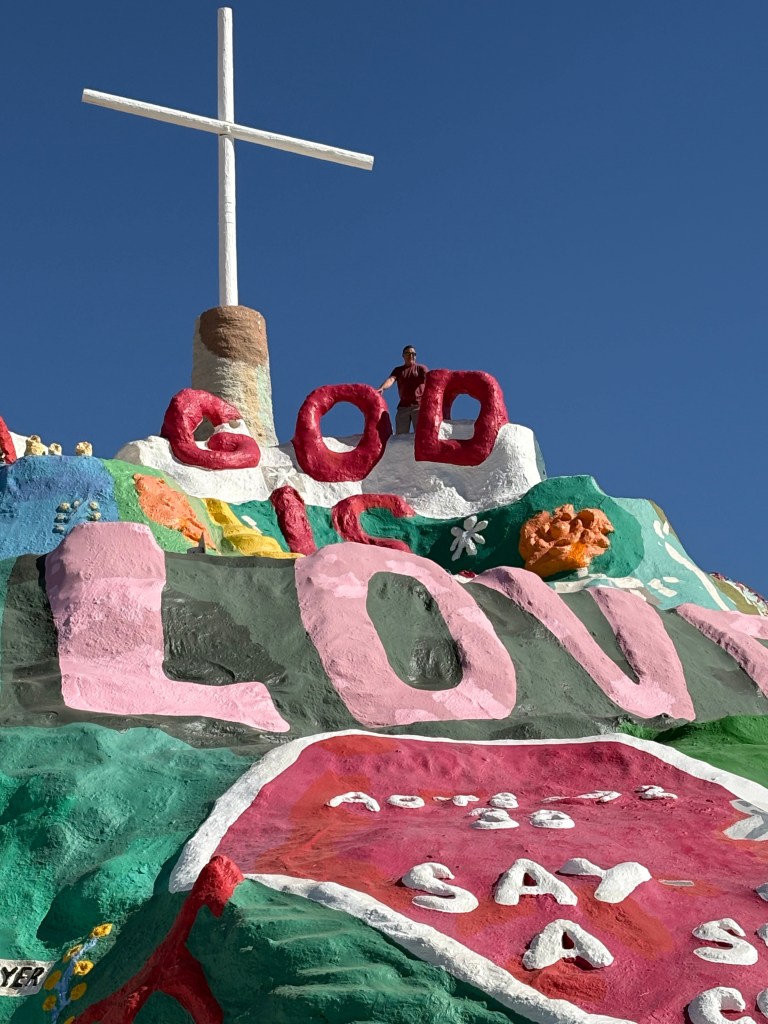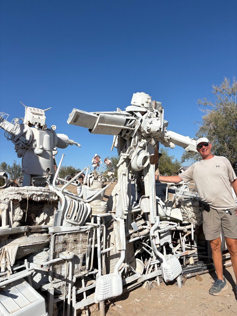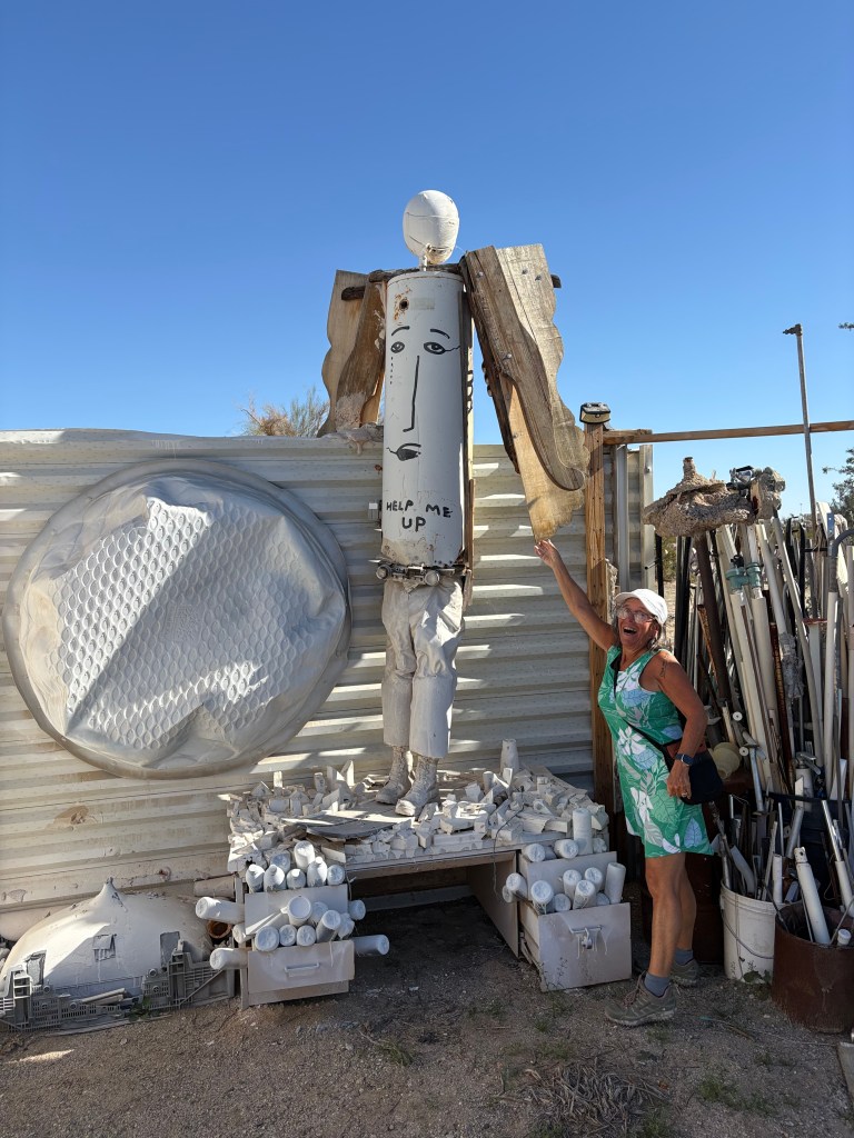 They even have a snack bar with burgers and chicken wings. We went swimming in the pool and laid in the sun and then we took a ride over the next day to slab city. It’s hard to describe slab city it’s like an off grid lawless land where people come and live and do art installations everywhere. It’s pretty cool. A lot of the sculptures that are made of junk are really cool to check out. It’s amazing what you will find.