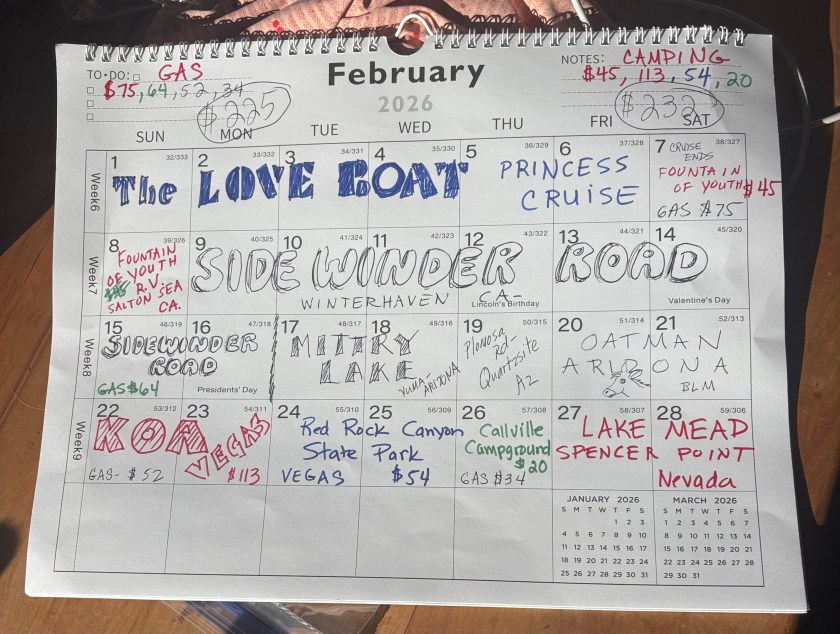 The last day of February. Boy that short month sure went by fast. Our total amount for camping was $232 and for gas was $225. It was a GREAT MONTH!!