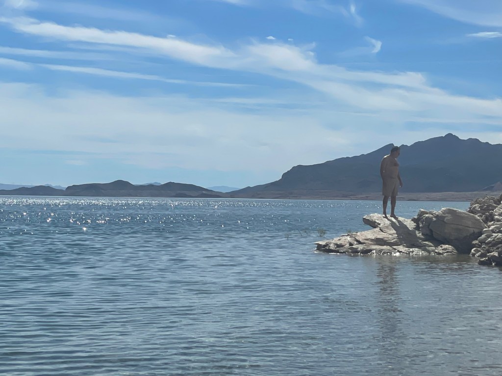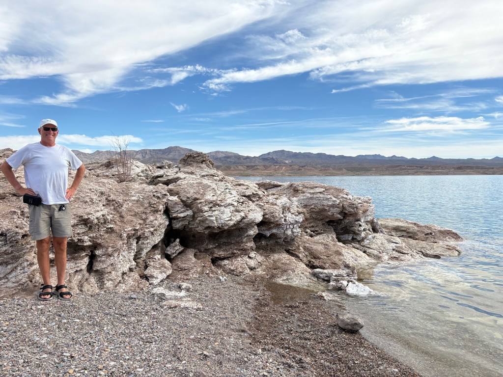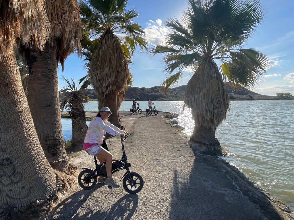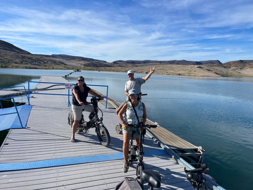 Next day we were off to the Lake Mead area. We stayed one night at the Callville Campground overlooking Lake Mead. Barbara and Frank were able to dump their tanks and get water for their camper and then we went on a nice bike ride down to the Marina. It’s amazing how far the water is from the campground. The campground used to be lakeside but not anymore.