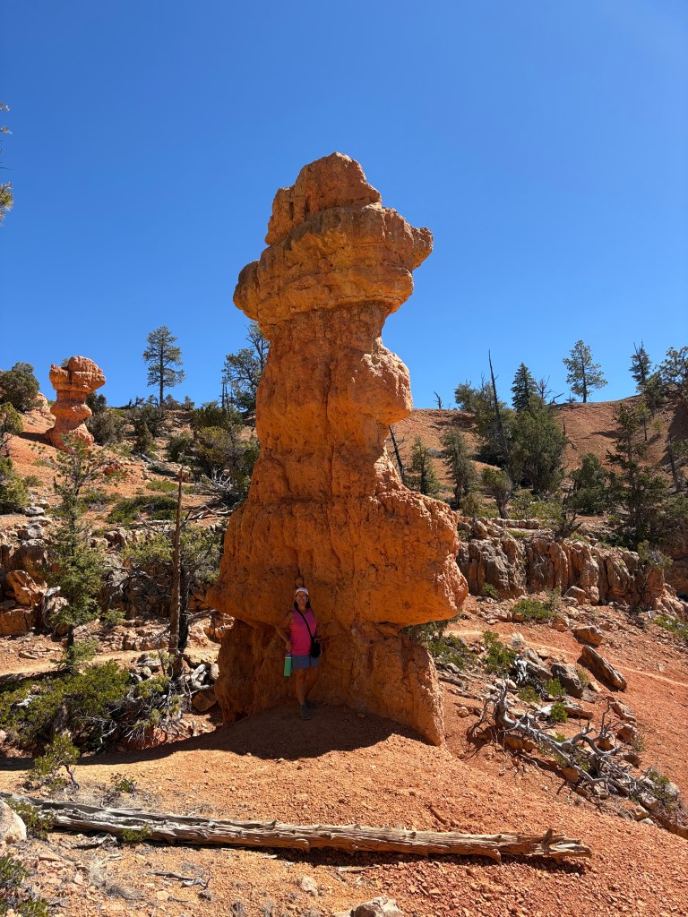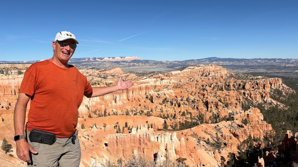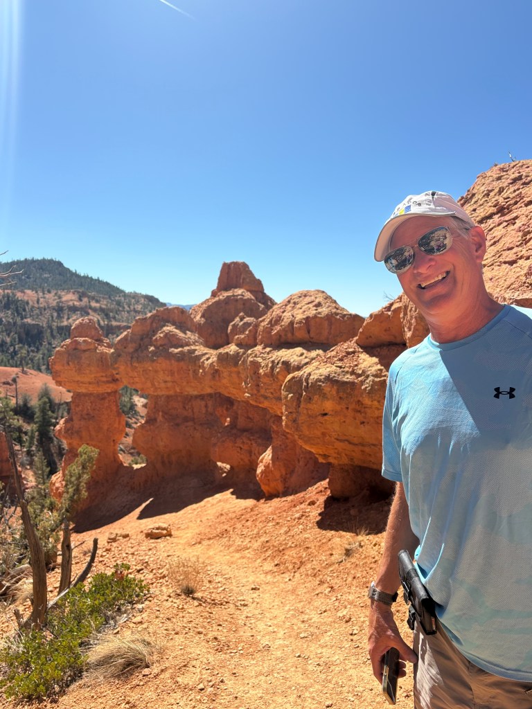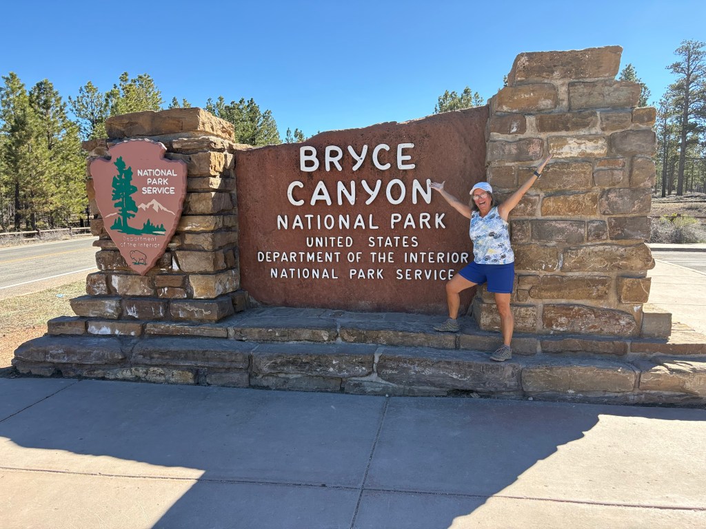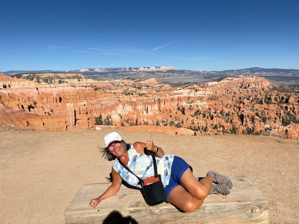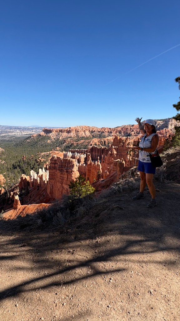 In the morning we headed back on Route 12,the all American Highway and not for the faint of heart. Lots of hairpin turns with no guardrails. A lot of elevation going over mountain passes. The white knuckle driving is definitely worth it because the views were spectacular. We arrived at Bryce and decided to go in to explore the Rim Trail and Lodge. We stopped at the visitor center and it was a mob scene.