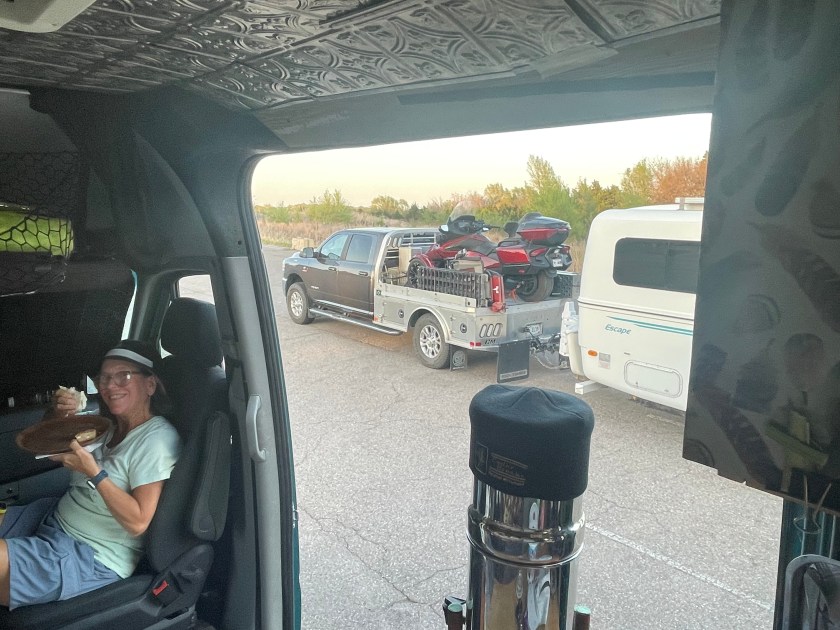 Next day we drove another two hours or so to Fritch Texas. The car thermometer read 102° which is really unheard of this time of year for northern Texas. We were happy that there was a breeze and places nearby that had air conditioning. We had pizza for dinner and really ate slow to enjoy the air conditioning in the place. Our spot overlooking Lake Meredith was awesome and we decided to stay for three nights as the temps went from 100° to 40° the next two days with winds that forced us to stay indoors for the most part.